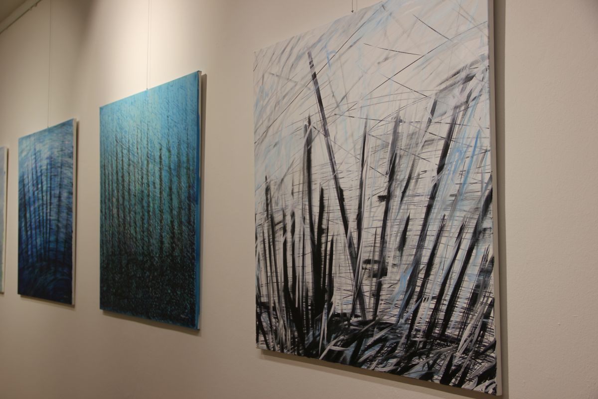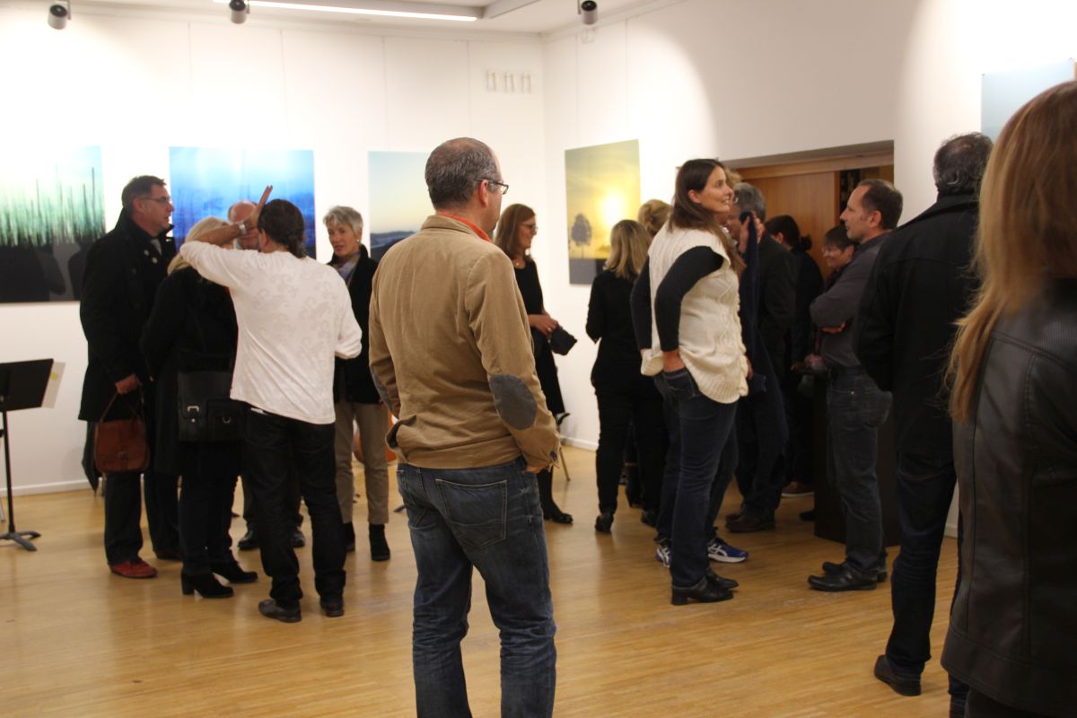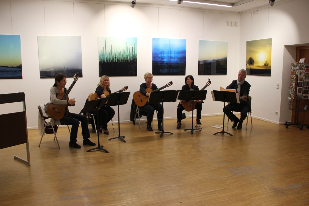 Musikalisch äußerst passend und anspruchsvoll wurde die Eröffnungsfeier umrahmt vom Gitarrenensemble belsuono, das sich aus durchwegs erwachsenen Schülerinnen und Schülern der Simon-Mayr-Sing- und Musikschule Ingolstadt formiert hat. Fünf akustische Gitarren, harmonisch aufeinander abgestimmt und sich in den Stücken quasi miteinander unterhaltend, eine der anderen den Takt vorgebend, das war ausgesprochen schön anzuhören und gab der Vernissage einen festlichen Rahmen.