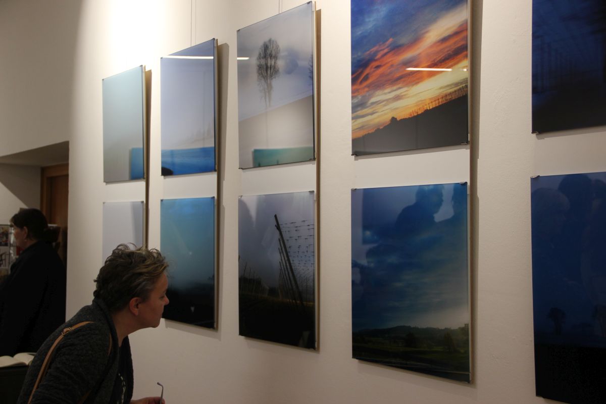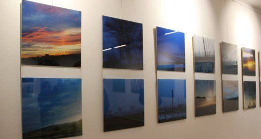 Entgegen des Namens der Ausstellung "Rund um die Holledau" stellt Manfred Spenger seine Exponate ausschließlich in quadratischen Formaten aus, was im Gesamteindruck des Betrachters etwas Beruhigendes und Harmonisches entstehen lässt, sobald er den Ausstellungsraum betritt. Die Fotografien sind weitestgehend geprägt von den Farbgebungen und Farbspielen der Tageszeiten, an denen sie aufgenommen wurden. Über der Landschaft liegender Nebel, der Lichtball der aufgehenden Sonne am Horizont oder helle Reflektionen der untergehenden Sonne zwischen einer vorherrschenden Bewölkung prägen die Bilder, wobei immer das typische Holledau-Motiv der Hopfenstangen enthalten ist. Um eine interessante Gegenüberstellung handelt es sich, wenn Sprenger ganz offensichtlich Fotos als Vorlage für Bilder und Zeichnungen genutzt hat. Hier wird deutlich, mit welcher Detailverliebtheit der Künstler an die Fertigstellung seiner Werke herangeht.