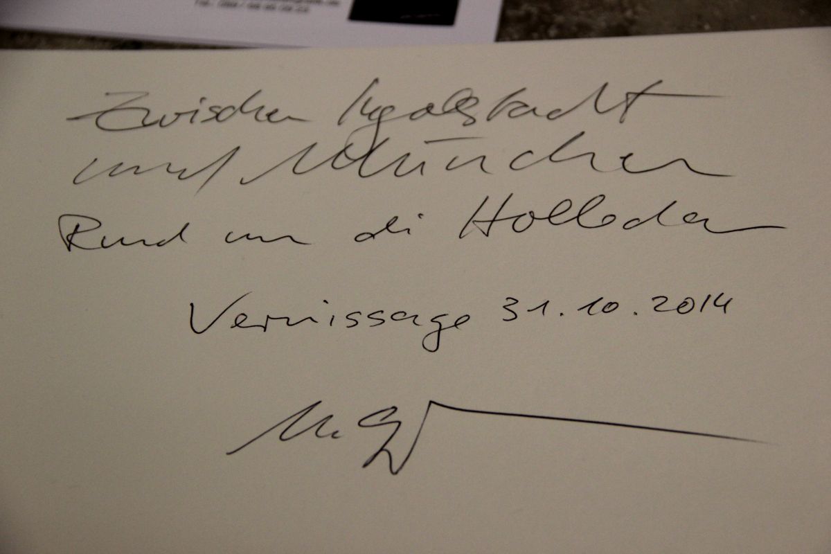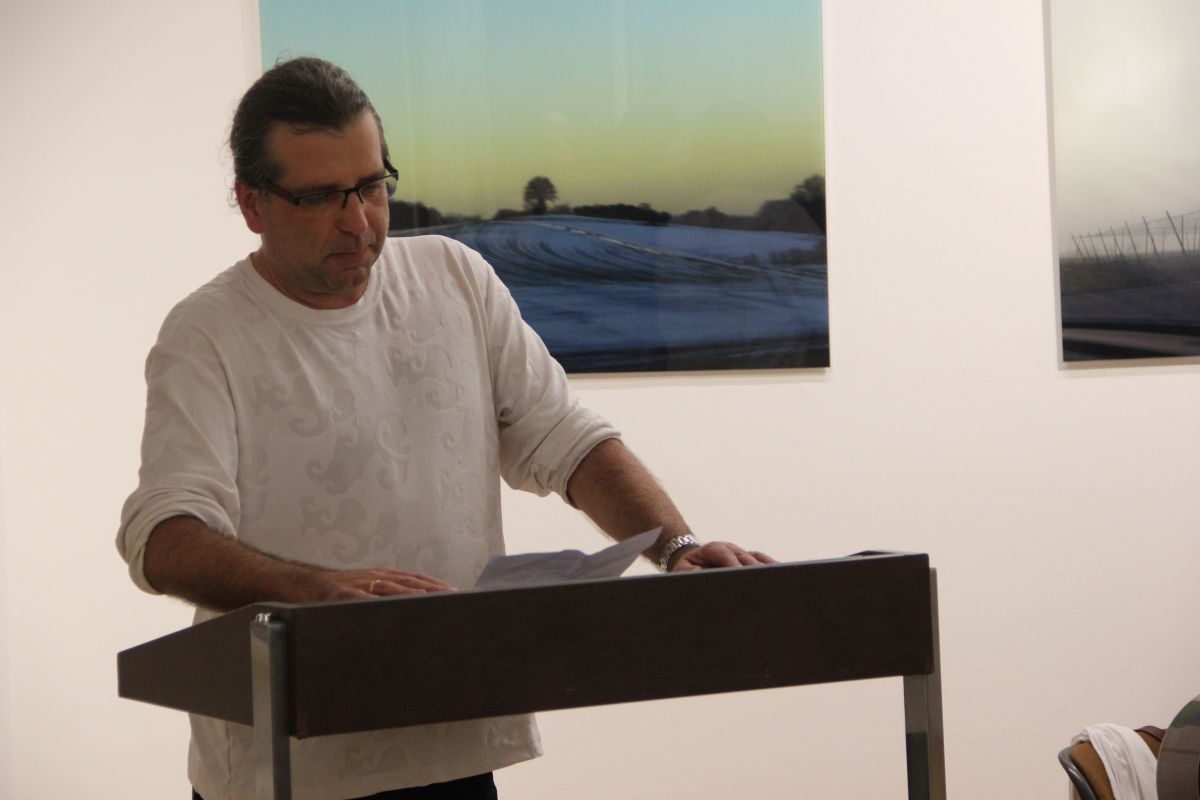 Als Laudator hatte der Künstler einen alten Freund und Weggefährten, den Journalisten Michael Heberling mitgebracht. "Notgedrungen verbringen mobile Menschen viel Zeit zwischen den Orten." skizzierte dieser sogleich die Ausgangssituation; viele würden jedoch - verständlicherweise - die Szenerien ihres Weges zur Arbeit nicht als fotogenes Sujet annehmen, wie es eben Spenger täte. Während der Großteil seiner Mit-Pendler auf die regelmäßigen Autobahn-Staus eher gereizt reagierten, habe den Künstler schon immer der besondere Reiz der Kulturlandschaft Holledau fasziniert.