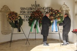 Worte, die gerade in einer Zeit, in der auch in Europa wieder Krieg möglich ist, die noch einmal deutlich machten, wohin die Spirale der Eskalation führt. „Um unsere Zukunft gestalten zu können, müssen wir unsere Vergangenheit kennen“, so Machold. Gemeinsam mit dem Krieger- Soldaten- und Kameradenkverein und dem VdK legte der Rathauschef dann sowohl am Ehrenmal für die Gefallenen beider Kriege, aber auch am Ehrenmal der Vertriebenen Kränze nieder. So ist dies nicht nur ein Gedenktag, sondern auch ein Appell dem Frieden eine Chance zu geben, den im Krieg verlieren letztlich immer beide Seiten.