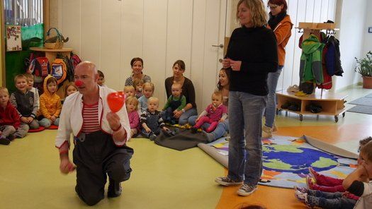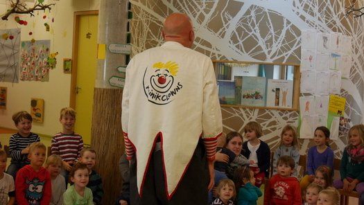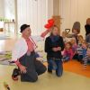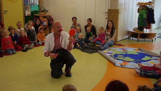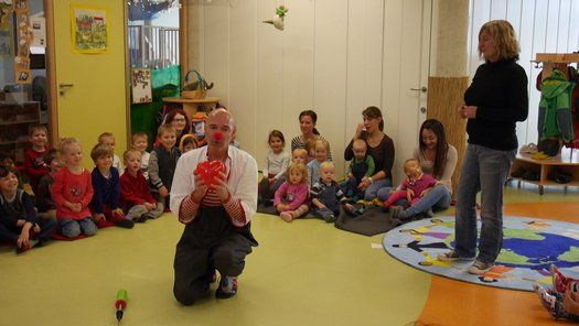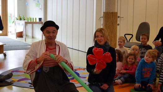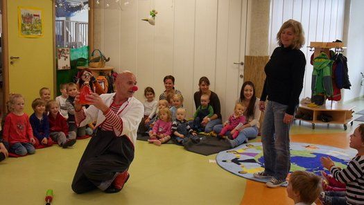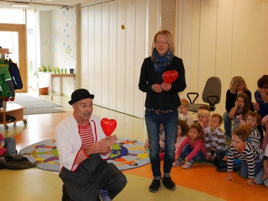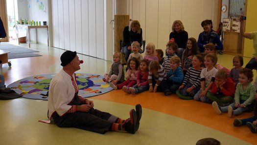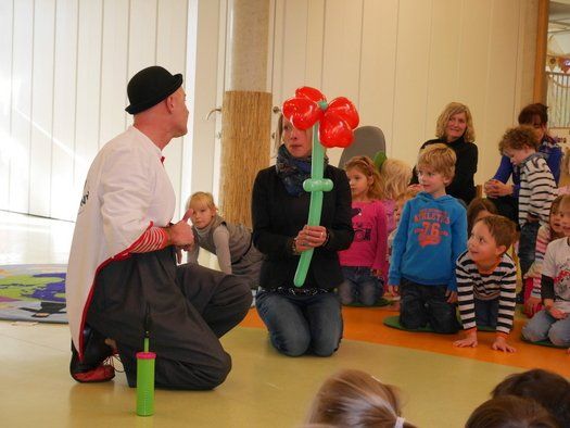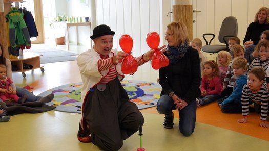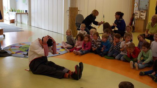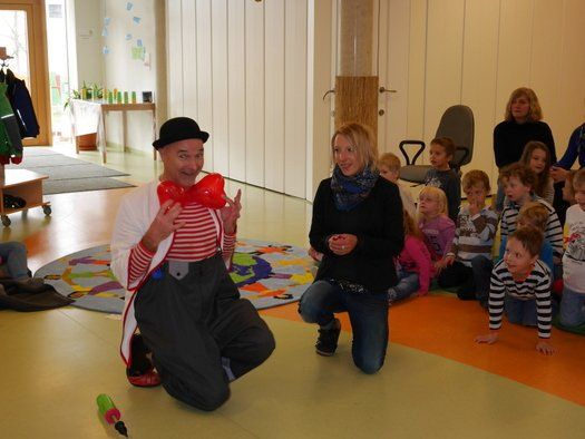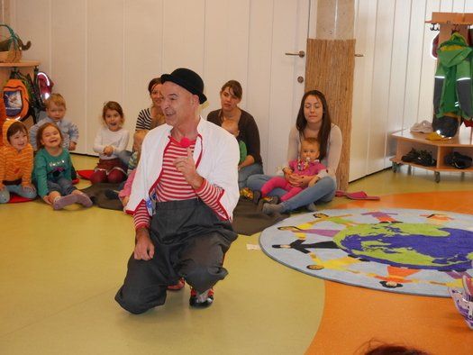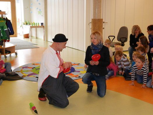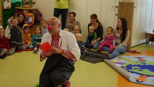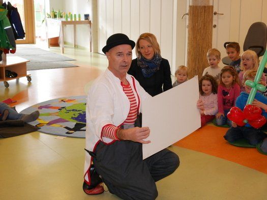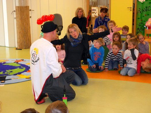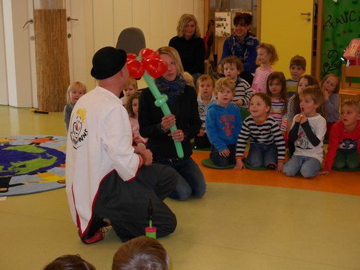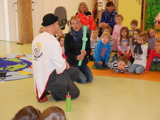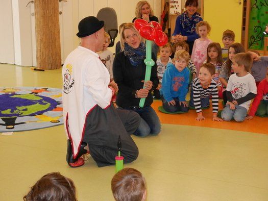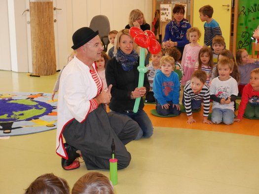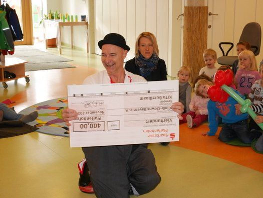Zur Scheckübergabe hatte die Chefin der Clowns, Karin Platzer, nämlich einen perfekten Vertreter ihrer Zunft in den Burzbaam entsandt. Mit LUPINO kam ein diplomierter Vollprofi mit einem eigenen Clownauto, die edlen Spender besuchen. Mit nicht nur einem Purzelbaum und entsprechend komplizierter Vorbereitung desselben, zauberte er sich in die Manege der KITA. Fast, oder noch besser wie im richtigen Zirkus, durften die Kinder bei seinen Kunststücken mitmachen.