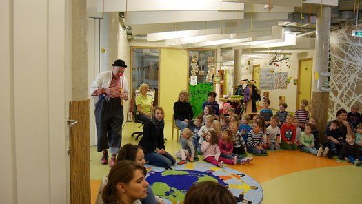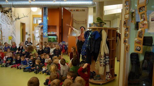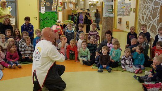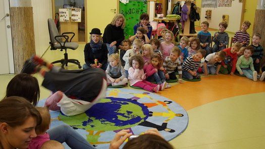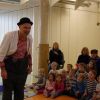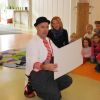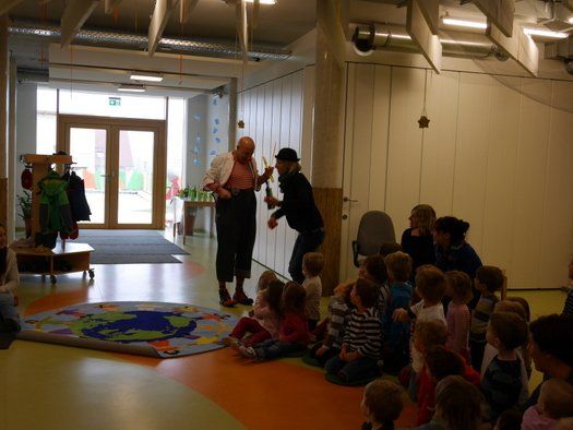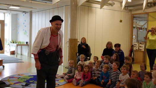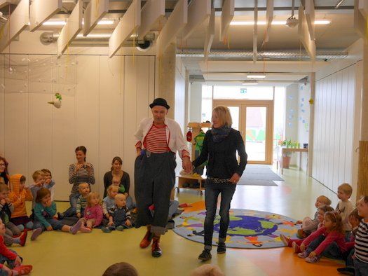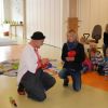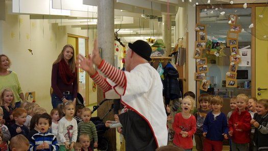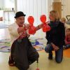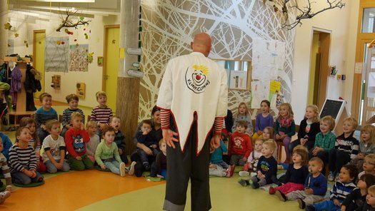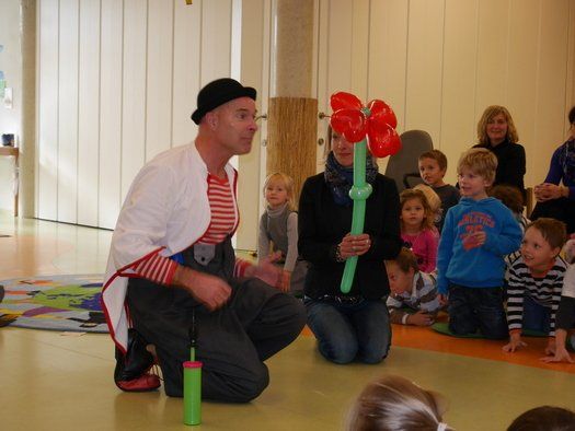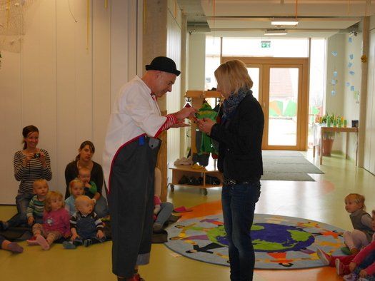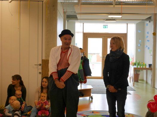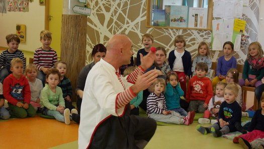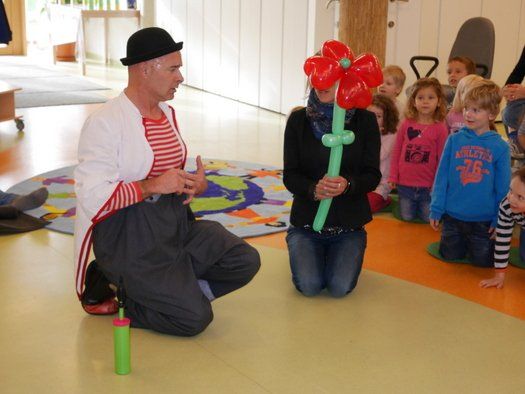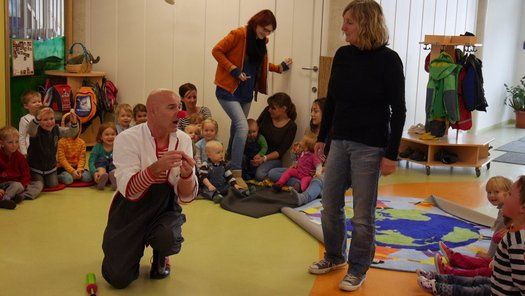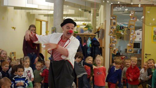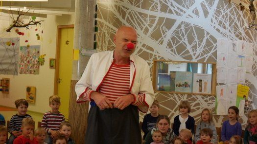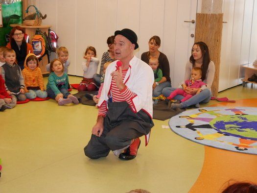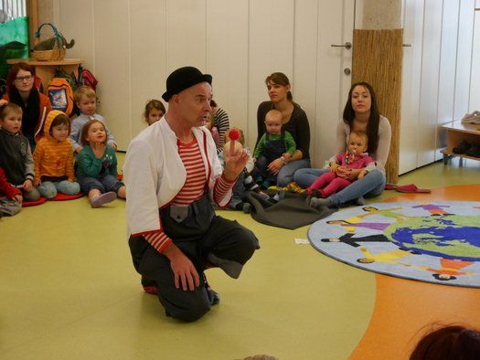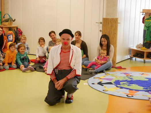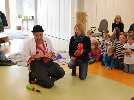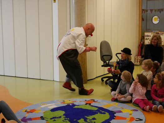 Zur Scheckübergabe hatte die Chefin der Clowns, Karin Platzer, nämlich einen perfekten Vertreter ihrer Zunft in den Burzbaam entsandt. Mit LUPINO kam ein diplomierter Vollprofi mit einem eigenen Clownauto, die edlen Spender besuchen. Mit nicht nur einem Purzelbaum und entsprechend komplizierter Vorbereitung desselben, zauberte er sich in die Manege der KITA. Fast, oder noch besser wie im richtigen Zirkus, durften die Kinder bei seinen Kunststücken mitmachen.