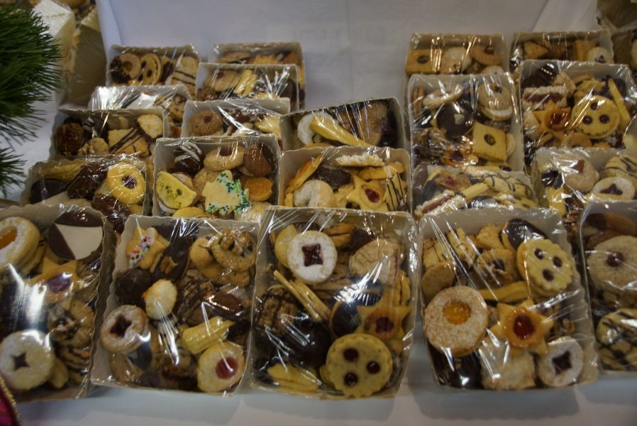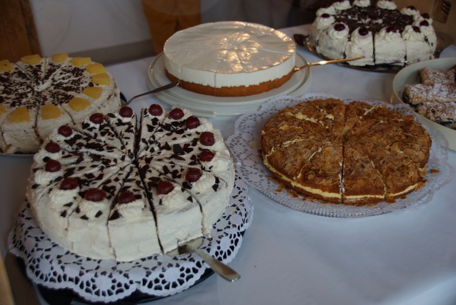 Alle anderen angebotenen Artikel waren ebenso selbstgebastelt, selbstgebacken oder selbsteingemacht, einzige Ausnahme waren die originalen Kripperlfiguren aus der heiligen Stadt Betlehem. Auch das riesige Kuchen- und Tortenbuffet befand sich noch im Eingang, und allen Wartenden lief schon das Wasser im Mund zusammen.