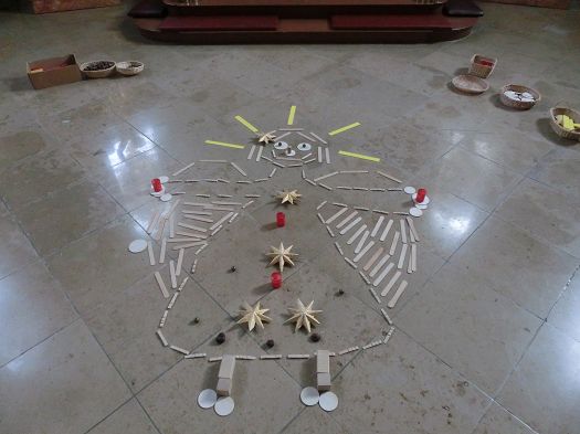 Anschließend legten die Kinder unter Anleitung hinter dem Altar auf dem Boden einen eigenen Engel aus Naturmaterialien aus.