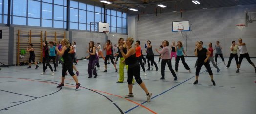 Das erste Mal fand die Zumba Best-Of Party 2014 des SV Geroldshausen gestern in der Preysinghalle statt. Rund 40 Fans des Fitness-Tanzes zu lateinamerikanischen Rhythmen waren gekommen, um unter der Leitung von Renate Merkl und Marietta Kolb zu allen Liedern des vergangenen Jahres noch einmal kräftig ins Schwitzen zu kommen – und das ganze zwei Stunden lang. In der kleinen Pause zwischendurch warteten dabei frische Obstspieße auf die Gruppe.