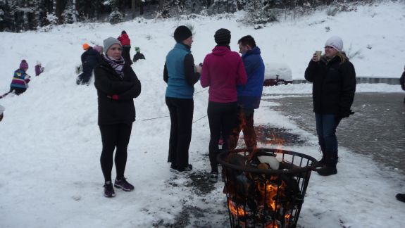 Beim Wandern bot sich eine prächtige winterliche Atmosphäre dar, die Bäume und Wipfel waren schwer mit Schnee bedeckt, die Luft war klar und rein. Als man am Ende dann alle versteckten Schätze gefunden hatte, wurden am offenen Feuerkorb Marshmallows gegrillt. Die Kinder hatten ihre helle Freude an dem Treiben, wälzten sich im Schnee oder bewarfen sich hie und da auch mal mit Schneebällen.