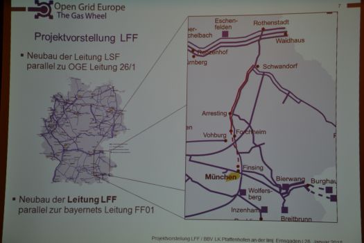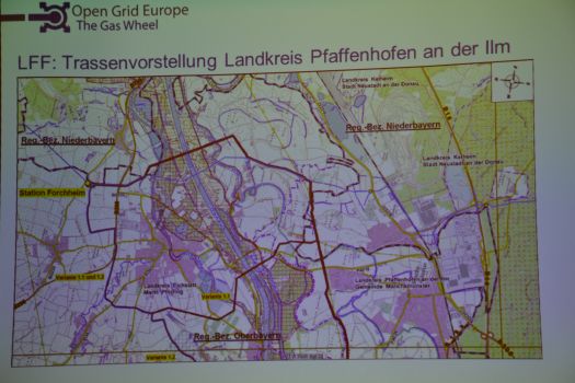 Der Jurist des Unternehmens „Open Grid Europe“, Dr. Andreas Bala, versuchte gleich zu Beginn der Veranstaltung zu beschwichtigen: Nicht die Anwesenden seien der Hauptwiderstand im Verfahren, sondern Betroffene und deshalb wolle man von Unternehmensseite bereits jetzt im Vorfeld die Gespräche mit den Betroffenen führen und er versprach gute Angebote zum Bodenschutz. Seine für Planung zuständigen Kollegen, versuchten anhand von Plänen und einer PowerPoint-Präsentation die Planung und den Trassenverlauf zu erläutern, wurden von den anwesenden Landwirten jedoch immer wieder unterbrochen. Sie führten aus, dass das Raumordnungsverfahren seit November 2014 laufe und das darauf folgende Planfeststellungsverfahren Mitte 2016 fertig sein soll. Mit Vorarbeiten in 2017 und Schwerpunkt 2018 soll der Bau abgeschlossen sein, wenn nicht, erwartet das Unternehmen von der Bundesnetzagentur eine Konventionalstrafe. Das Unternehmen versuche alle möglichen Kriterien zu berücksichtigen, dabei sind 19 Kommunen und 5 Landkreise betroffen und die Pläne müssen mit den generellen Planungen des Landes, der Kreise und Gemeinden abgestimmt werden. Man habe in der Planung einen großen Teil der Trasse parallel zur Bayerngas-Trasse geplant, doch im Gebiet um Neustadt, Ernsgaden, Ilmmünster sei diese Parallelstrecke aufgrund verschiedener technischer und planerischer Einschränkungen nicht möglich, deshalb wurde auch keine Trasse durch den Bannwald im Dürnbucher Forst bei der Planungsbehörde eingereicht.