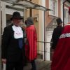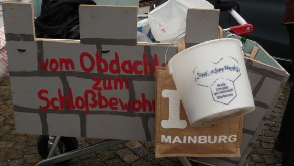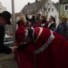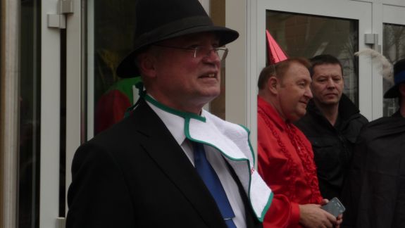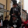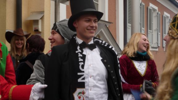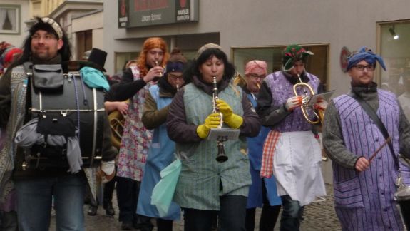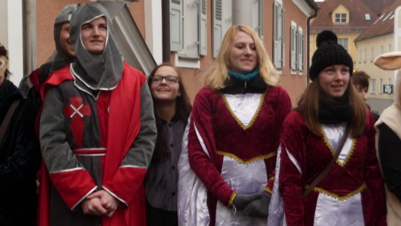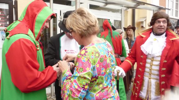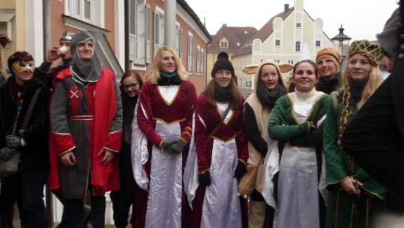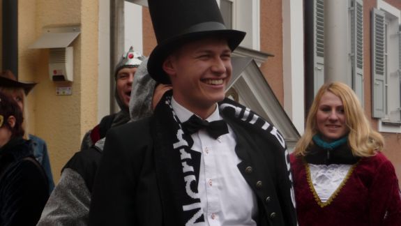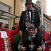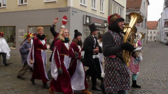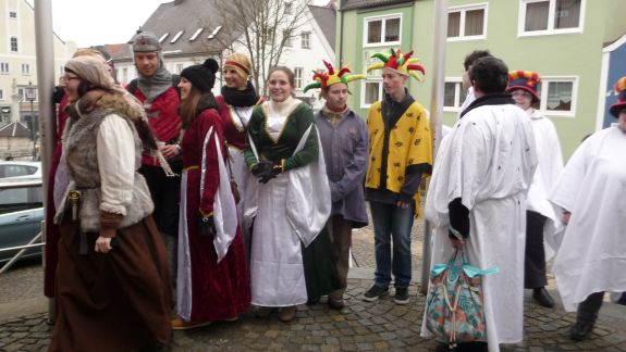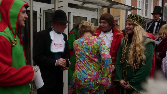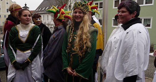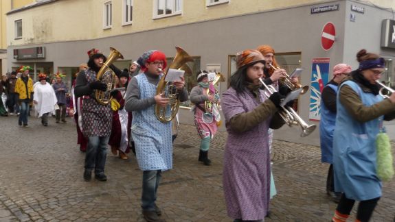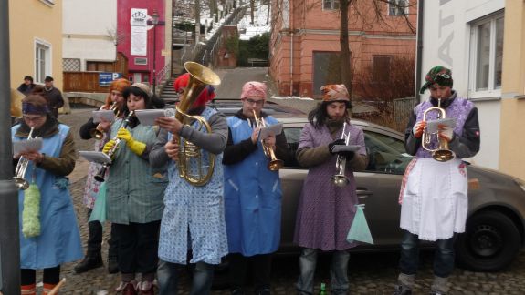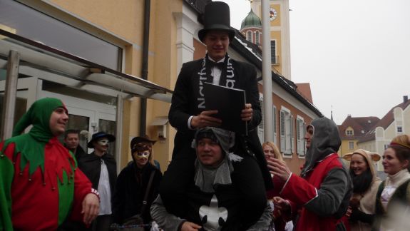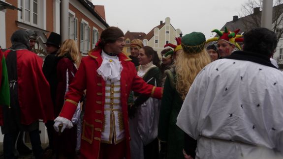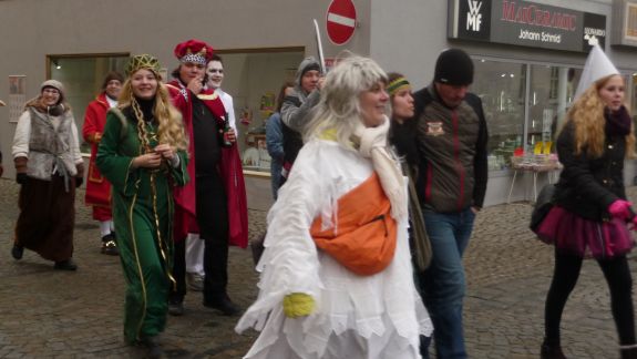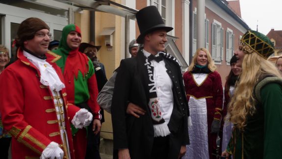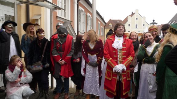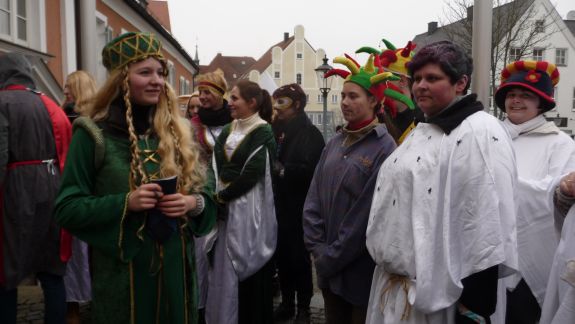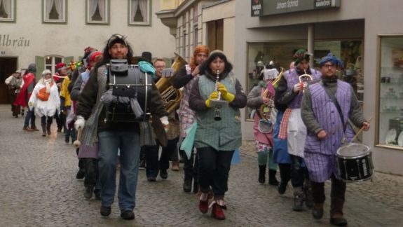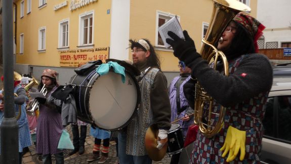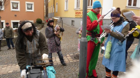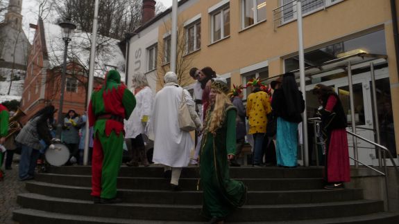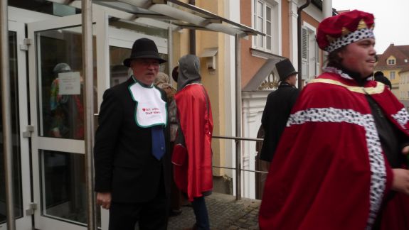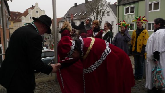 „Wenn heid oana mit de Bratzn d´Arbat oriert, dem wead oane gschmiert!“, plärrte der Prinz mit Nachdruck hoch zu Ross herunter. Gleichzeitig verkündete er die noch ausstehenden Auftritte bis zum endgültigen Schluss mit dem Kehraus am kommenden Dienstag. Samt Einkaufwagen mit der Aufschrift „Vom Obdachlosen zum Schloßbewohner“ und fahrbarer Grilltonne zog der Tross durch die Stadt und erfreute dabei so manchen Spaziergänger und Schaulustigen, auch wenn diese wahrlich nicht recht zahlreich vorhanden waren. Musikalisch von der MAI-Musi begleitet und als Burgfräuleins, Ritter sowie Schlossherrn verkleidet statteten sie den örtlichen Geschäften einen lautstarken Besuch ab und konnten dank der exzellenten Verköstigung und den bereitgestellten Durstlöschern die Fußmärsche im eiskalten Freien wunderbar bestehen.