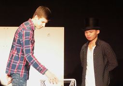Jugendliche der Kolping Bildungsmaßnahme brachten sich selbst immer wieder ein, ob in einer Bodypercussion, als Zauberer oder auch bei Bühnenbild und Fotos, die auf eine Leinwand projeziert wurden und immer eine kurze Geschichte beleuchteten.