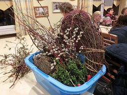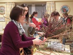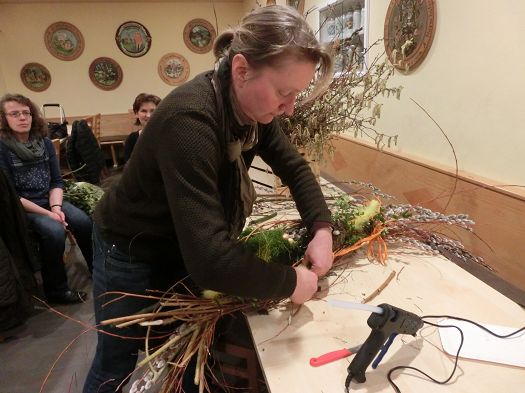 An die 20 Frauen kamen, schwerbepackt mit allerlei Material aus der Natur, wie Ästen von Palmkätzchen, Weide, Birke und Haselnuss, oder Moos und Rinden in den Gasthof Huber in Hausmehring. Den Rest, z.B. blühende Zwiebelblumen, bunten Bast, Federn, Eier usw stellte Heidi Sommer zur Verfügung.