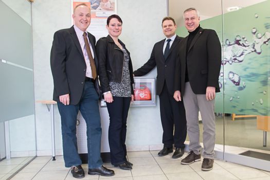 Stolz, dass der Defi da ist, dennoch hoffend, dass er so wenig wie möglich eingesetzt werden muss: Ludwig von Fabris, Carina Huber-Seibert und Rainer Müller (alle IHR Gewerbevereinigung) sowie Reichertshausens Bürgermeister Reinhard Heinrich (von links)