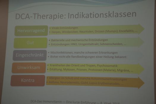 In seinem Vortrag hob Radim Vlcek hervor, dass DCA kein medizinisches Wundermittel sei, das aber bei Menschen mit einem zu geringen DCA-Wert bei viralen und bakteriellen Entzündungen helfen kann. Am eigenen Beispiel erläuterte der anwesende Werner Borgstedt aus Mainburg die Wirkung von DCA. Er selbst hatte vor 25 Jahren erstmals Kontakt mit diesem Mittel. Er wurde von einem Heilpraktiker auf eine junge Frau angesprochen, die mit einer schweren, unerklärlichen Krankheit im Klinikum lag. Borgstedt tippte auf Pfeiffersches Drüsenfieber und empfahl, die Kranke nach Hause zu holen. Nach einer DCA-Gabe über einige Tage waren das Fieber und alle Schwellungen verschwunden. Nach 10 Tagen konnte das Mädchen wieder in die Schule gehen.
