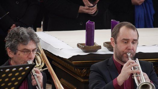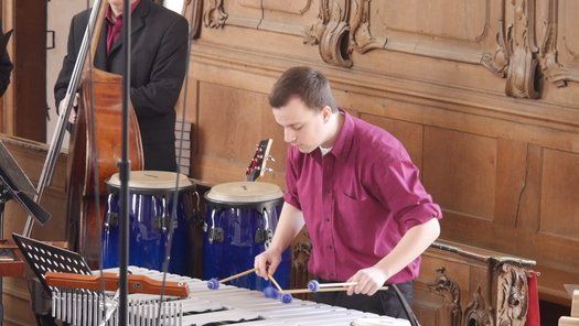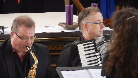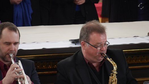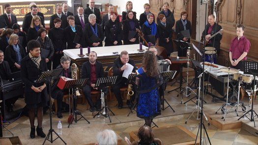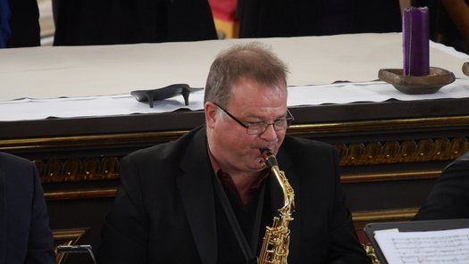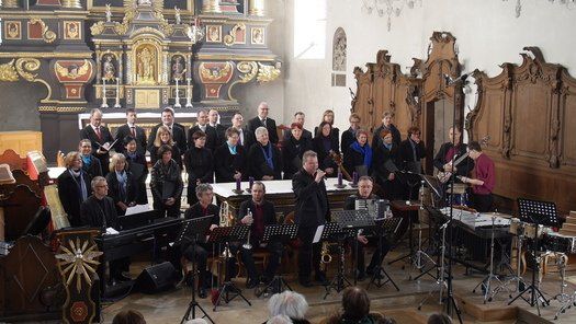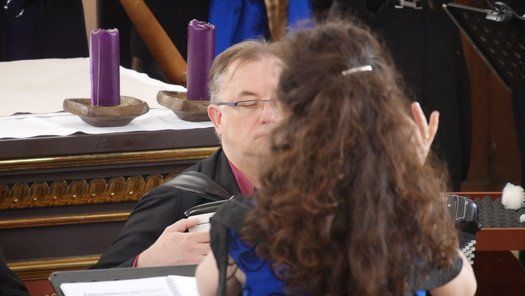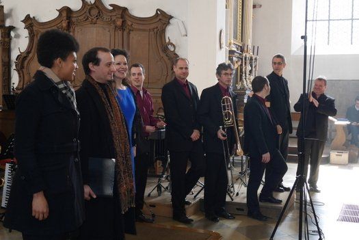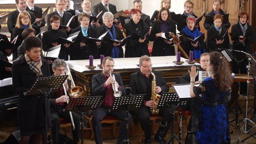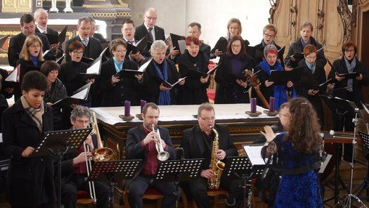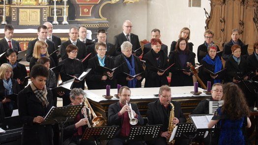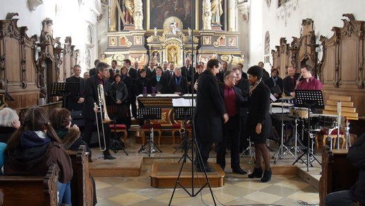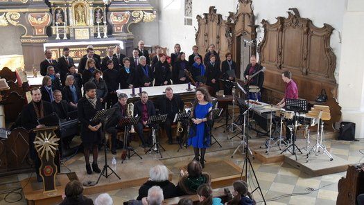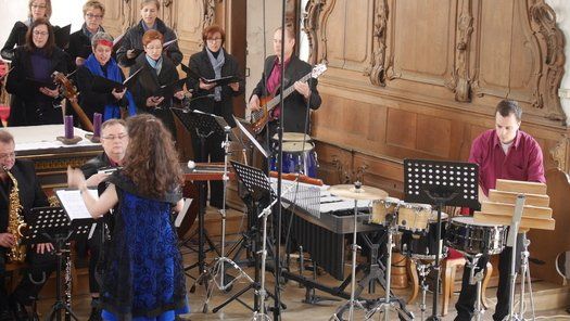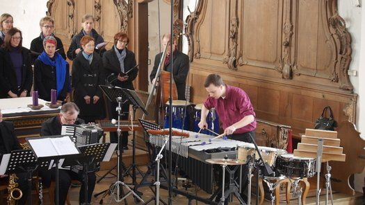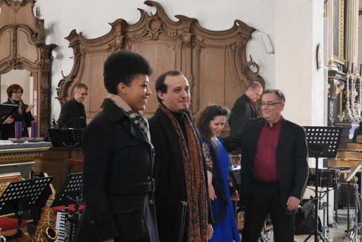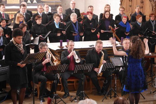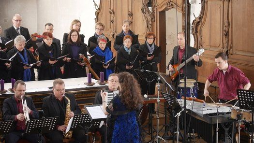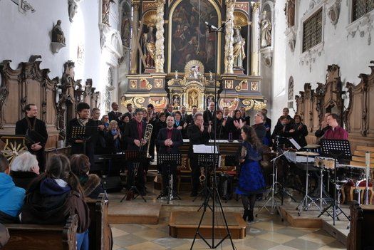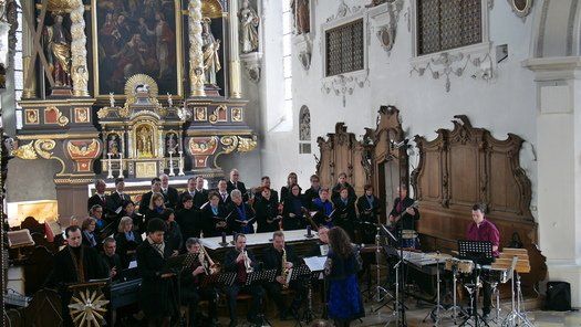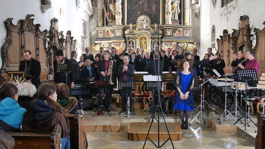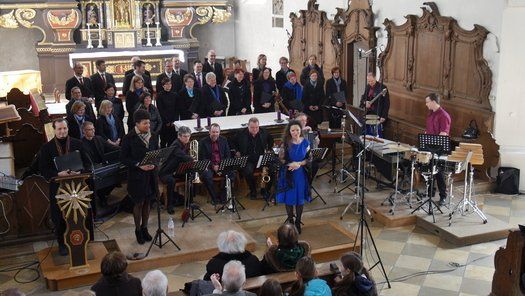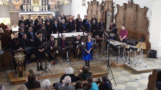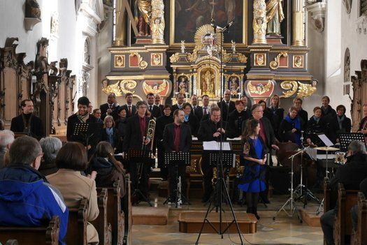 Auf dem Programm stand „Missa in blue“ von und vor allen Dingen mit dem, noch lebenden, Komponisten Musikprofessor Peter Wittrich und seinem „Peter-Wittrich-Sextett“. Die Solo Partien gaben Idunnu Münch (Sopran) und Martin Danes (Bariton), unterstützt vom Kammerchor „A-cappella-nova“. Als Solisten an ihren Instrumenten sind auf jeden Fall Max Hanft (E-Piano) und Stephan Halbinger (Vibraphon) zu erwähnen.