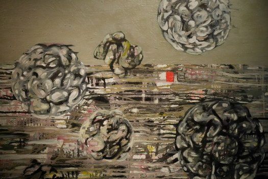 Nur das markante „Bühnenbild“ mit den fünf Jazz Musikern ist noch älteren Datums (2012). Die Fünf heben sich aber nicht wirklich von der Serie ab, sie bilden eher den Anfang einer Entwicklung die fast im Gegenstandslosen endet. Afrikanische Wurzeln, Helene ist in Kamerun geboren, könnten unbewusst bei der Motivwahl zu den „Steinhaufenbildern“ Pate gestanden haben.