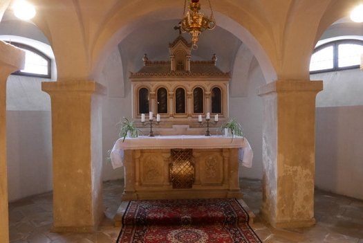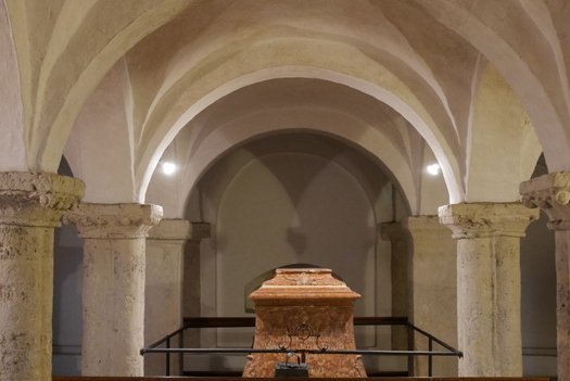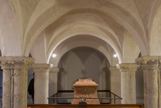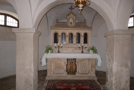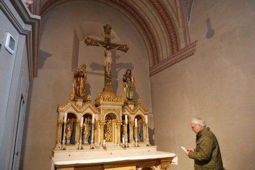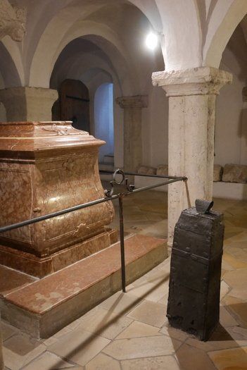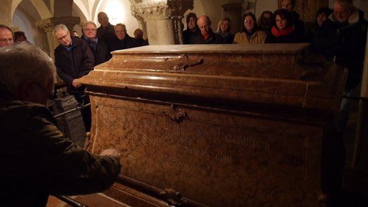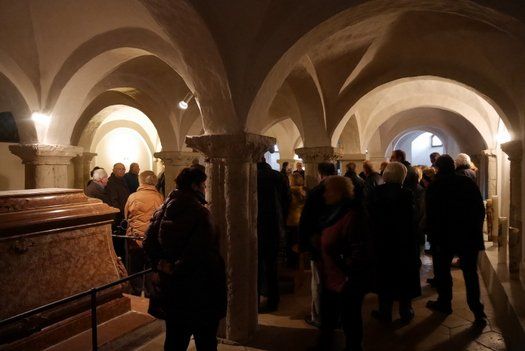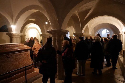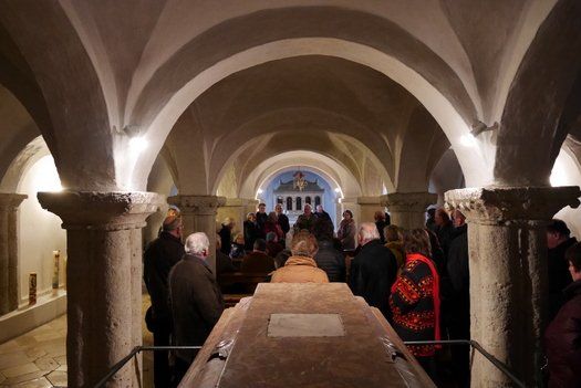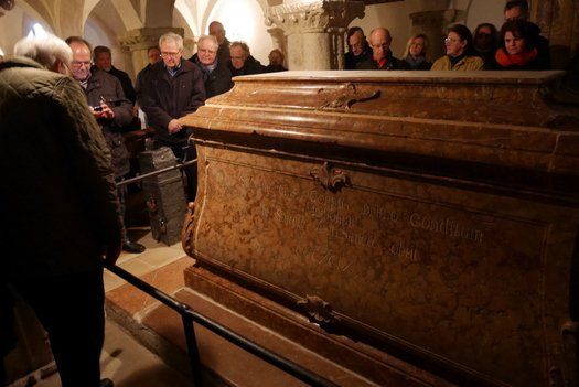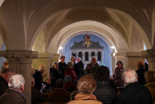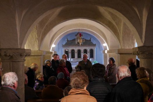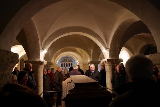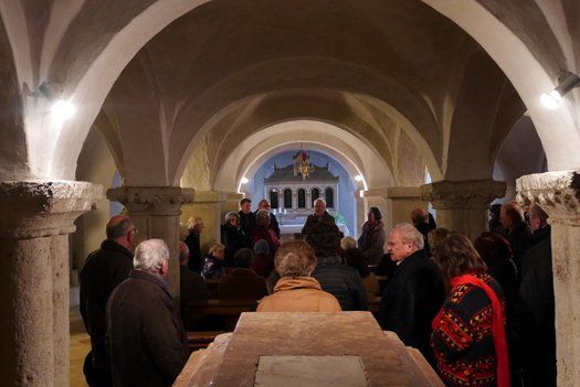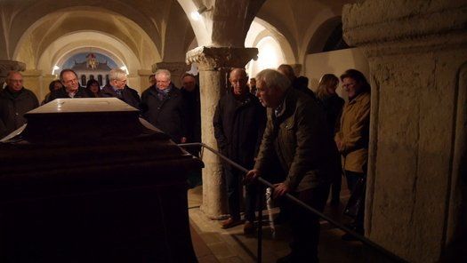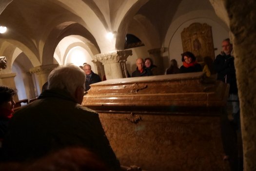 Der Hausaltar mit einer alten Ansicht des Ortes mit der Basilika und einer um 1900 abgerissenen Kirche daneben, hatten es ihm angetan. Genaueres zu Figuren und Ausstattung bereicherte den gut 90 minütigen Rundgang, der in der Krypta endete. Dort übersetzte er aus dem Stegreif die lateinischen Inschriften auf dem Sarkophag und den Grabplatten der Immünster Mönche.