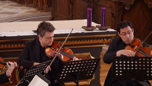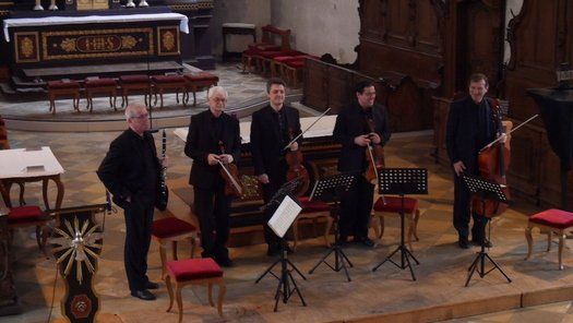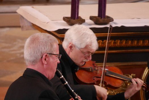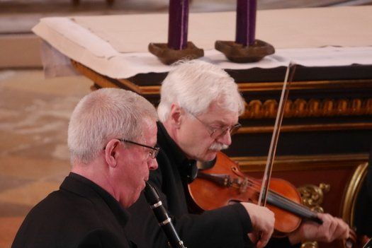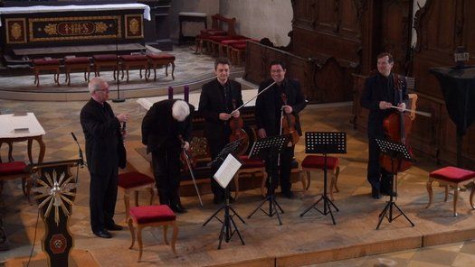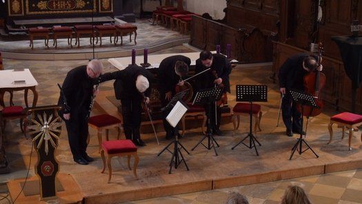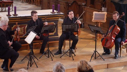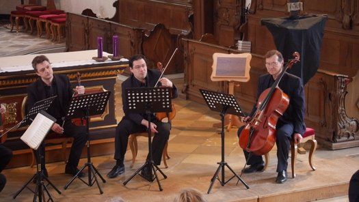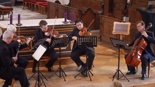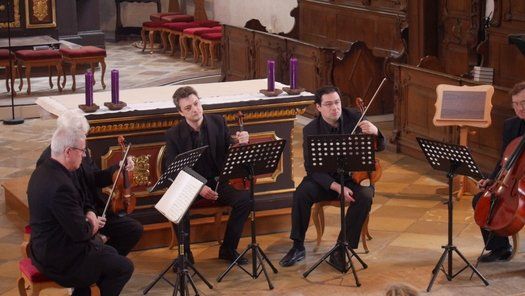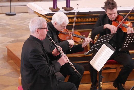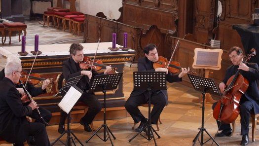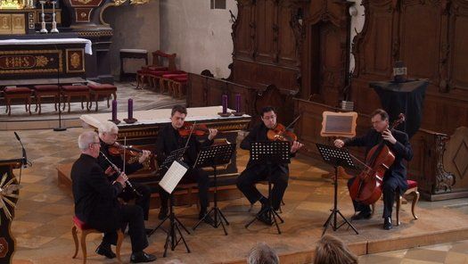 – Allegretto con variazioni, gespielt von dem Streichquartett Del’Arte, mit Viktor Konjaev an der ersten Violine, Alexander Konjaev an der zweiten Violine, Vadim Makhovskiy an der Bratsche und David Tskhadaja am Violoncello. Rainer Maier an seiner Klarinette gab den von Mozart so geliebten Teil an dem zu seiner Zeit noch seltenen Instrument.