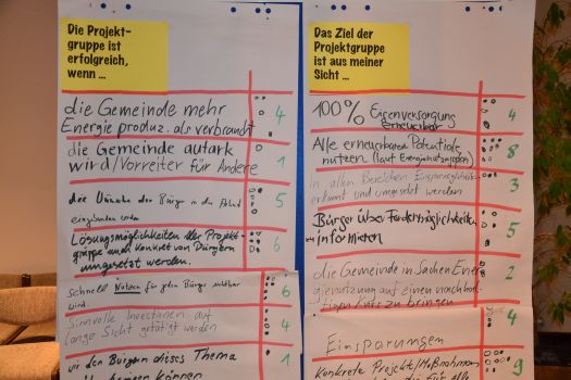 Als Programmpunkte für die zweite Sitzung legten die Teilnehmer die Formulierung der Projektgruppenziele fest, wollten über die Organisation der Projektgruppe entscheiden, Zuständigkeiten klären, konkrete Projekte diskutieren, die Windkraftplanung näher untersuchen, eine Energie-Startberatung sowie den Umgang mit Informationen besprechen.