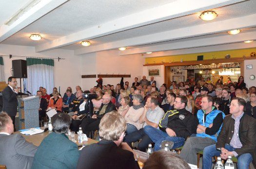 Das Interesse an der Veranstaltung war derart groß, dass nicht einmal die zusätzlich beschafften Bierbänke im Windener DJK-Vereinsheim ausreichten. Mit Außenlautsprechern wurde die gut drei Stunden dauernde Diskussion vor das Vereinsheim übertragen, denn auch dort hatten sich zahlreiche Bürger eingefunden, die drinnen keinen Platz mehr fanden.