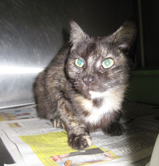 Mika, so wurde die Katze benannt, ist ca. 1 Jahr alt, ihre Fellfarbe ist schildpatt schwarz-braun. Leider ist Mika nicht gekennzeichnet und sehr unterernährt.