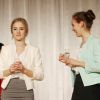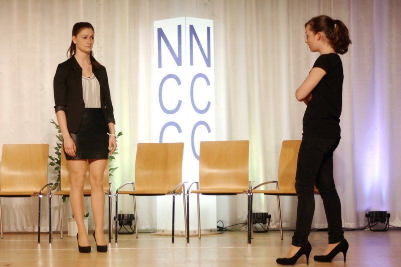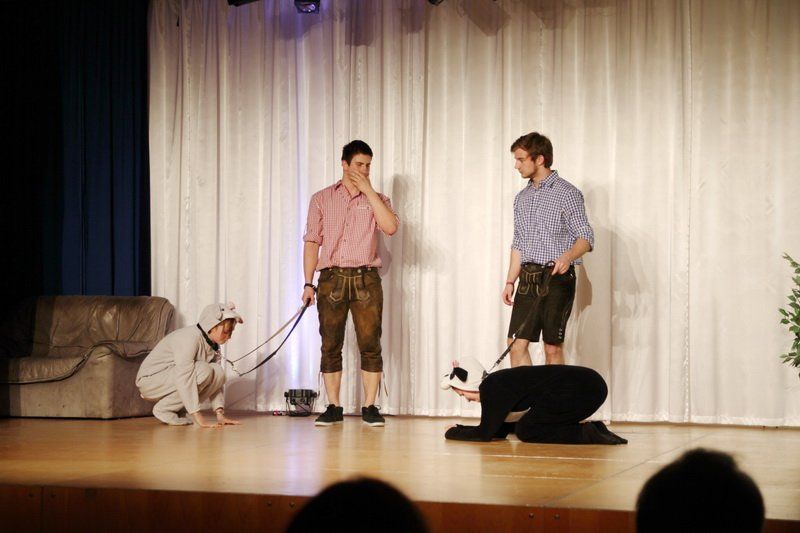 „Top Dogs“ von Urs Widmer ist ein brandaktuelles Stück, das sich mit den Zuständen hinter den Kulissen der großen Konzerne beschäftigt. Die Geschäftswelt hat sich im Streben nach mehr Profit und Macht selbst radikalisiert und wer nicht folgen kann, wird zurückgelassen. An der Darstellung dieser Zurückgelassenen probten die Schüler des Kurses seit Oktober. Gestern brillierten sie mit intensivem, humorvollen, energiegeladenem Spiel in ganz unterschiedlichen Gruppen- und Einzelszenen. Unter der tiefenentspannten Führung der Psychologin Haselsteiner geben die Entlassenen immer mehr zu, wie der Verlust der Existenz an die Nieren geht. Empathisch schwer gehandicapt kann auch das Privatleben keinen Halt bieten – sie haben keines. Sie sind es nicht gewohnt, sich mit Normalverdienern auseinandersetzen zu müssen. In ihren Träumen jedoch verblasst die antrainierte Emotionslosigkeit neben den Wünschen, die die Figuren insgeheim hegen – sei es die ersehnte Anerkennung durch die kalte Mutter oder den Ex-Chef von einem Gipfel in den sicheren Tod zu stoßen.