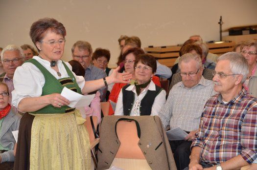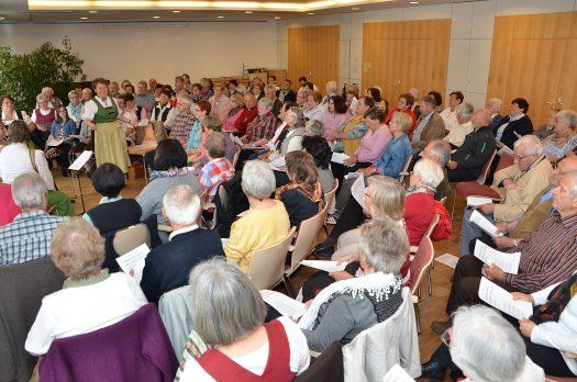 Zur Stunde wird das vierte „Offene Singen“ im Pfaffenhofener Hofbergsaal veranstaltet. Das mit Uschi Kufer zusammen mit Angela und Franz Nischwitz vom Fördervereins bayerische Sprache und Dialekte organisierte Treffen sangesfreudiger Menschen lockte über 120 Teilnehmer an. Mit „horch, was kommt von draußen rein?“ ging es an den Start unter der musikalischen Führung der „Holledauer Tanzbod’nfeger“ Irmi Grünwald und Rosa Karger weiter mit viel bekanntem Volksliedgut.