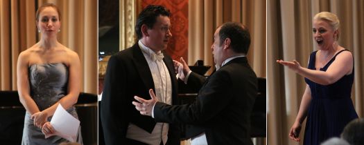Diese Lockerheit in der Musik färbt auf die Künstler ab. In einem regelmäßigen Wechsel treten Maria Czeiler (Sopran), Benedikt Linus Bader (Tenor) und Jens Müller (Bariton) auf die Bühne. Am Flügel werden sie über den gesamten Abend begleitet von Susanna Klovsky, die auch die Moderation übernimmt und frei und unbeschwert durch das Programm führt. Dabei lernt das Publikum eben nicht nur den musikalischen Hintergrund der Kompositionen kennen, sondern auch die Persönlichkeiten der Komponisten.