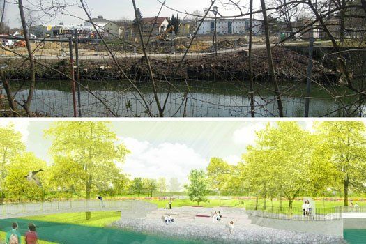 Einen ersten andeutungsweisen Ansatz kann man bereits an der Gestaltung des Flutgrabens erkennen. Zwar muss dieser zunächst in seiner Profilgestaltung nach wie vor dem Hochwasserschutz gerecht werden, der Sohlbereich gewinnt gestalterisch aber durch die Auslegung mit Natursteinen und den geschwungenen Lauf des Abflussgerinnes.