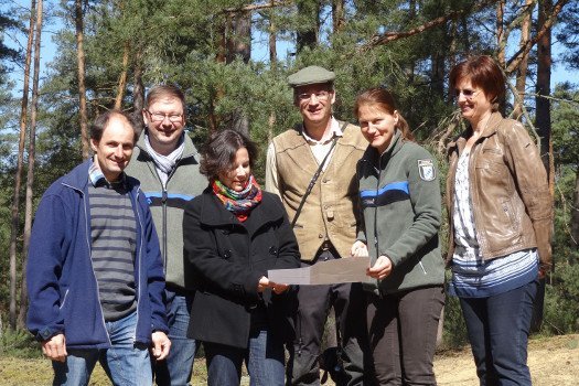 So sollen etwa die typischen Lebensgemeinschaften der offenen Sanddünen in ausreichender Größe sowie die enge Verzahnung mit angrenzenden Kiefernwäldern erhalten werden. Robert Hierlmeier, Biologe beim Landschafts-pflegeverband VöF, erläutert den Behördenvertretern vor Ort die konkret durchgeführten Pflegemaßnahmen. In Abstimmung mit den jeweiligen Revierförstern Lukas Wack und Winfried Scharold sowie dem Bund Naturschutz als Flächeneigentümer wurden verschiedene Durchforstungsarbeiten veranlasst.