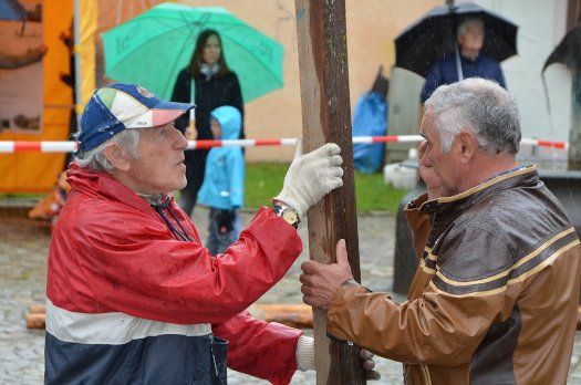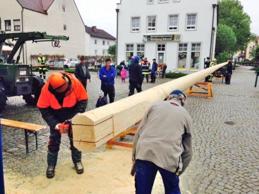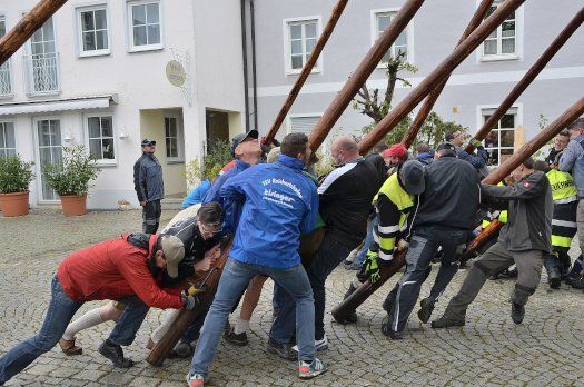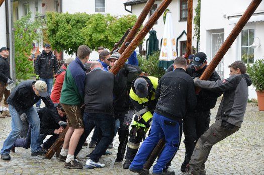 Unter der Oberaufsicht von Capo Forstwirt Ulrich Gassler hat Anschaffer Bernhard Gruber, seines Zeichens Zimmerer von Beruf, dafür gesorgt, dass die Stangenpaare auch an der richtigen Stelle eingesetzt wurden, ohne dass sich der Stamm zu sehr zur Seite neigt. Das war diesmal gar nicht so einfach, weil es nach vielen Jahren heuer erstmals wieder geregnet hat am 1. Mai und das Holz entsprechend rutschig war.