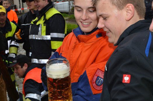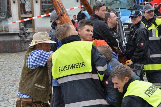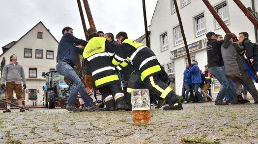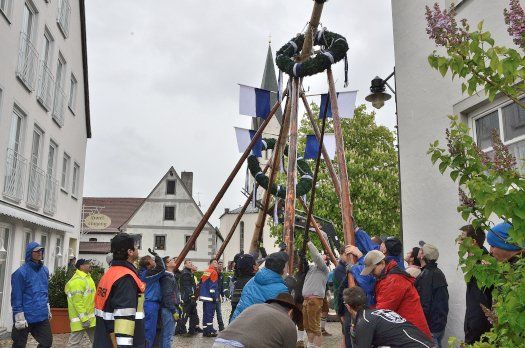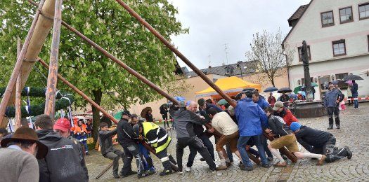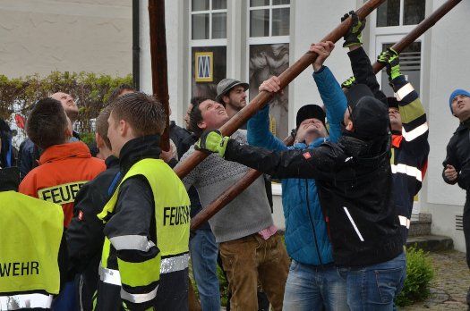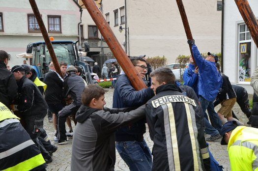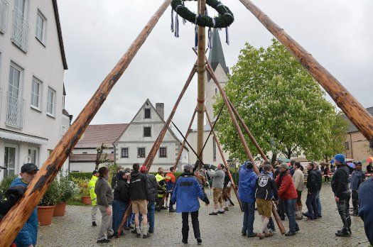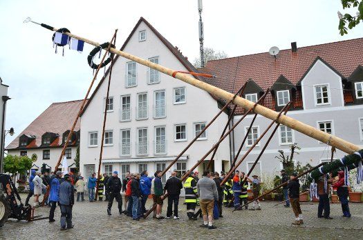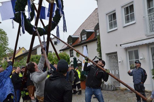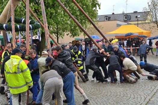 Mehr als 50 Mannsbilder der Maibaumgesellschaft Reichertshofen, die sich unter anderem aus Mitgliedern vieler Vereine und der Feuerwehr zusammensetzt, haben bei anhaltend strömendem Regen ihre 28 Meter lange Fichte innerhalb von gut zwei Stunden mit viel Muskel- und Hirnschmalz in die Senkrechte gebracht.
