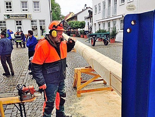 Am morgigen Sonntag wird noch der Stammfuß bis in zwei Meter Höhe mit Holzlatten verblendet und eine Sitzbank angebracht, dann kann das Prachtstück die nächsten Monate in seiner ganzen Pracht bestaunt werden.