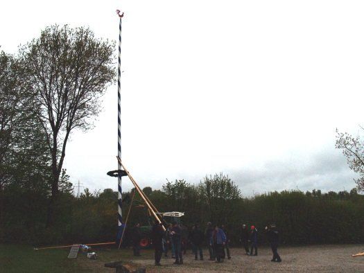 Vom Dauerregen haben sich die Mitglieder des Tennisclubs Au nicht die gute Laune verderben lassen und pünktlich am 1. Mai ihren Maibaum aufgestellt. Das Aufstellen mit Bulldog und viel Manneskraft ging ohne Probleme über die Bühne und die Tennisler können wieder stolz auf sich und ihr Prachtexemplar mit 17, 5 Meter plus rotem Gockel sein.