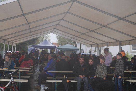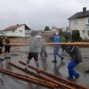 So schnell wie in diesem Jahr waren die Männer vom Schützenverein Hopfavogl, die traditionell das Dorffest ausrichten, aber noch nie. Der leidige Dauerregen erwies sich als nerviger Spielverderber, möglicherweise hat es sogar in die Getränke geregnet, des geht gor ned. Also Aufstellen und im Anschluss unter das bereitgestellte große Zeltdach, der Rollbraten sollte nicht auch noch kalt werden.