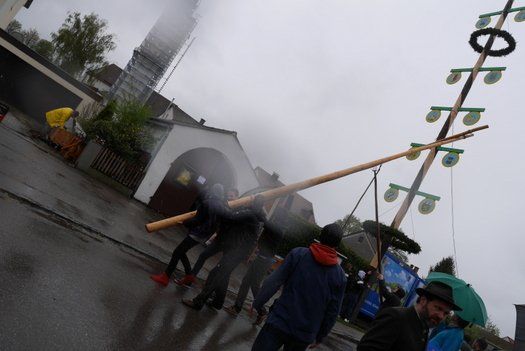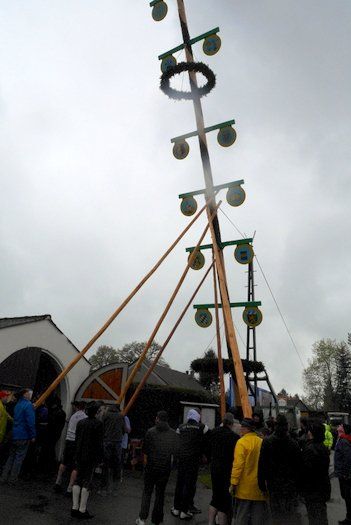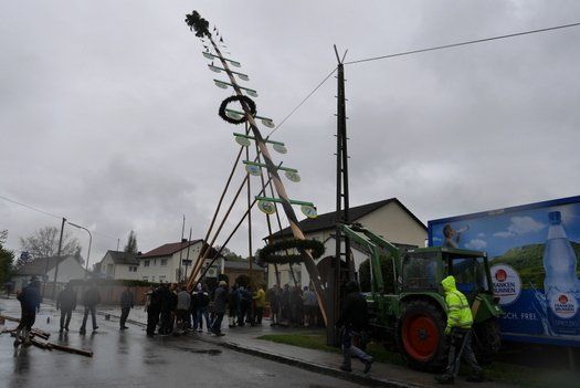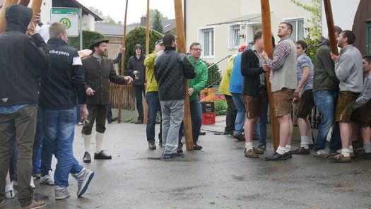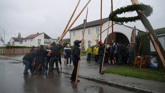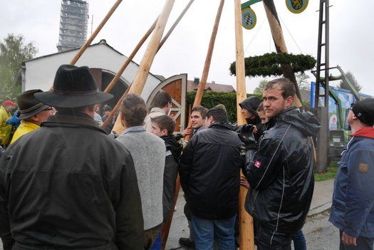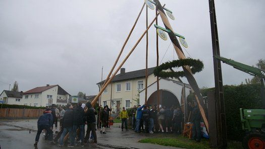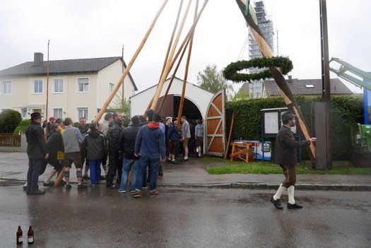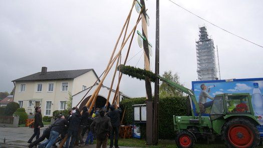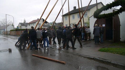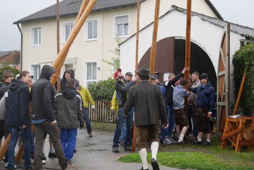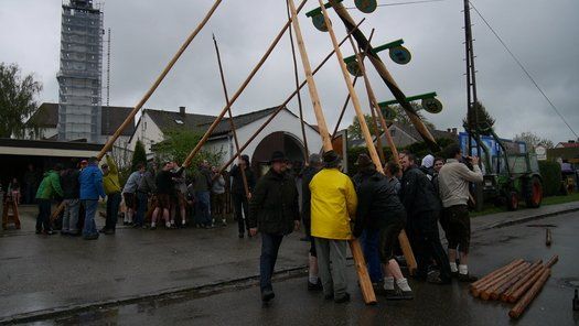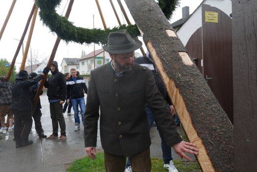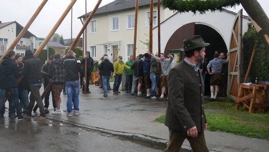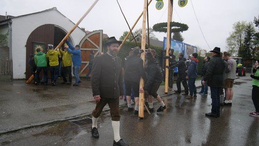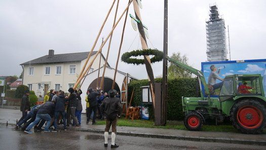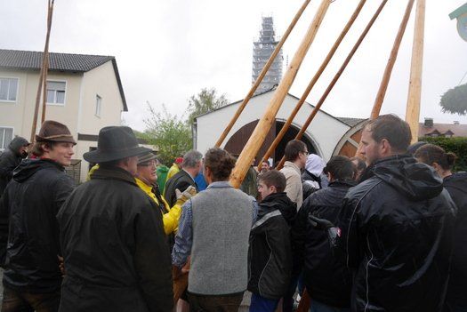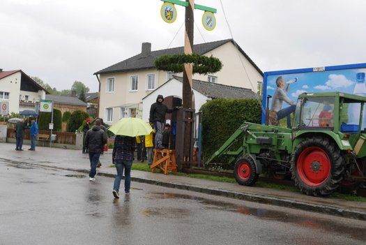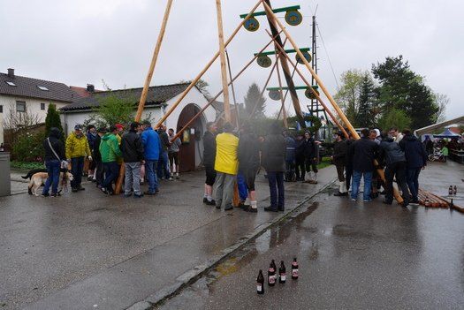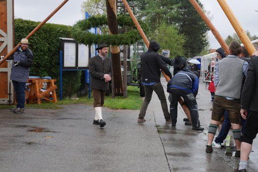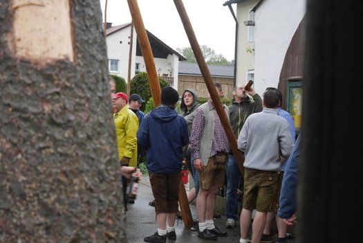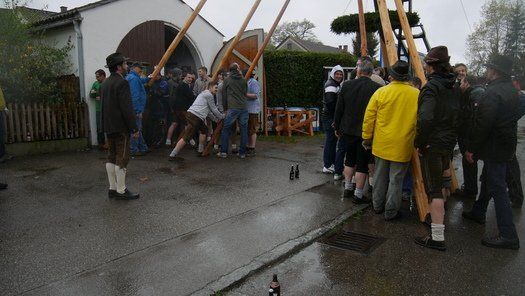 Gemeinsam, HoooooooooooooRuck, zirka 50 Mal hallte der Ruf am 1. Mai durch Niederscheyern. Hier wird der Maibaum noch jedes Jahr „hantisch aufgstanglt“, der bereitgestellte Fendt diente nur zur Sicherung, so will es die Vorschrift.