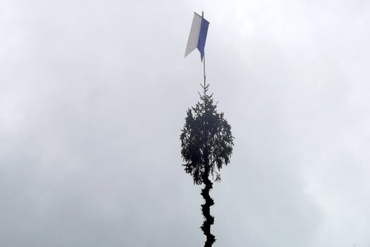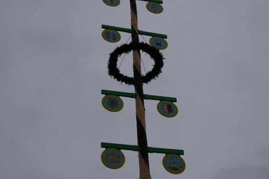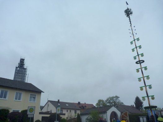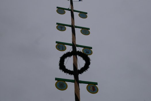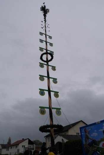 „Kircherseit´n ziegt oh!“ Gemeinsam, HoooooooooooooRuck, die Niederscheyrer Maibaumtruppe schob Stück für Stück, Meter für Meter, den naturbelassenen und festlich dekorierten Festbaum in die Senkrechte. Prächtig handgemalte Zunftschilder schmücken nun wieder die Zierde des Ortsmittelpunktes. Kein Maibaumdiebstahlsversuch wurde gemeldet und die Freinacht war auch ruhig.