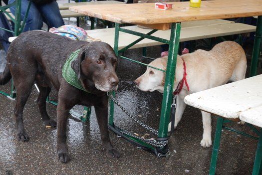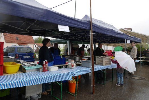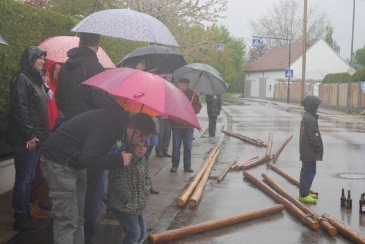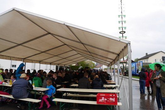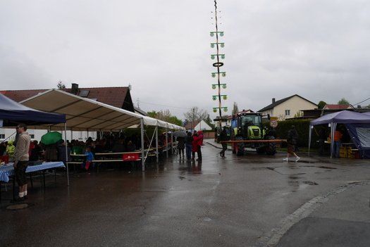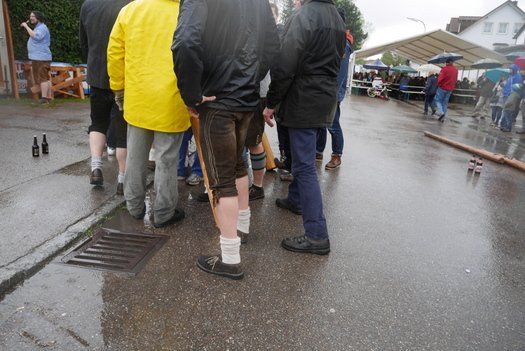 Die Hüpfburg war leider verwaist, aber Bratwürste und Getränke fanden trotzdem ihre Abnehmer. Viele frisch Zugezogene haben wieder ein Lehrstück in Dorfgemeinschaft und Feierlust erfahren, die sich durch den Wettergott auch nicht kleinkriegen lässt. Fazit: „As Wetter is wias is, Hauptsach da Baam steht und koaner hod se weh do!“