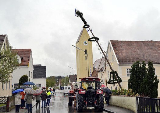 Mit vereinten Kräften hat die Dorfgemeinschaft Hög vorm Söltl Gasthof ihre 23 Meter hohe Fichte, aufgestellt. Das ist dieses Jahr besonders praktisch gewesen, da der Weg zum Feiern nicht weit und jeder froh war, bei dem anhaltenden Regen möglichst schnell ins Trockene zu kommen.