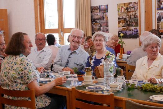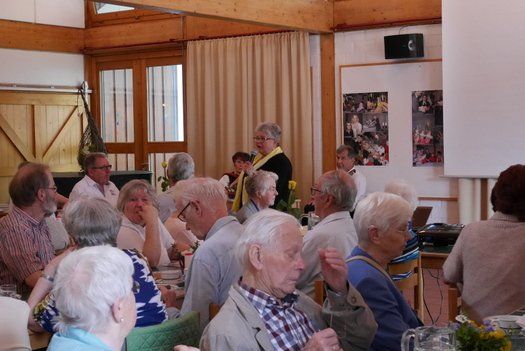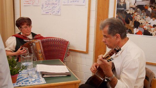 Die Dekoration des Senioren Cafés war stilecht bayerisch und zur Unterhaltung trugen Uschi Kufer am Akkordeon und Josef Gürtner mit seiner Gitarre bei. Die evangelischen Senioren sind von der Geburt her größtenteils nichtbayerischen Ursprungs, also eher aus dem Norden, wo klimabedingt der 1. Mai noch ziemlich kalt und nass ist. Den Fruchtbarkeitsbrauch des Baumaufsteckens oder der Brauch, die frischen Birken mit bunten Bändern zu schmücken, fällt dort eher in den Juni.