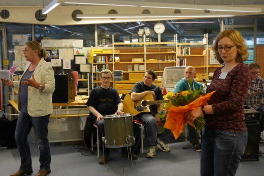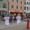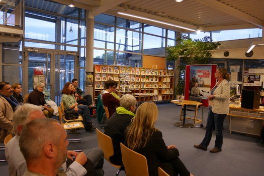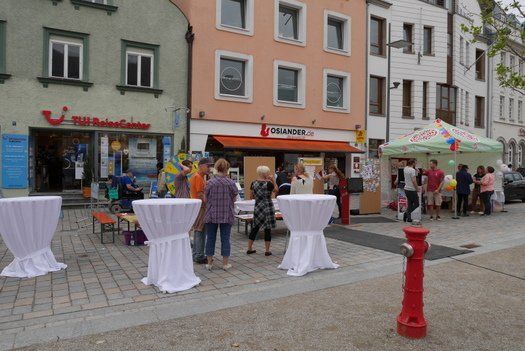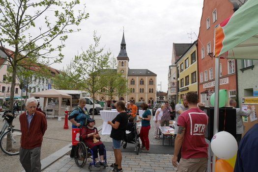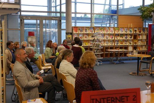 Nach den öffentlichen Aktionen zum gleichen Thema, Informationsstand am Wochenmarkt und einer Lesung in der Stadtbücherei, die 2. Bürgermeister Albert Gürtner begleitete, fanden sich die Unterstützer mit Gästen in den Räumen der Kreisbücherei ein. Stadtrat Manfred "Mensch" Mayer begrüßte mit einer kleinen Ausführung in leichter Sprache und bedankte sich bei der Gastgeberin Dipl.Bibl. Elisabeth Zeidler für den ersten Schritt, Bücher in Leichter Sprache in den Bestand der Bibliothek aufzunehmen.