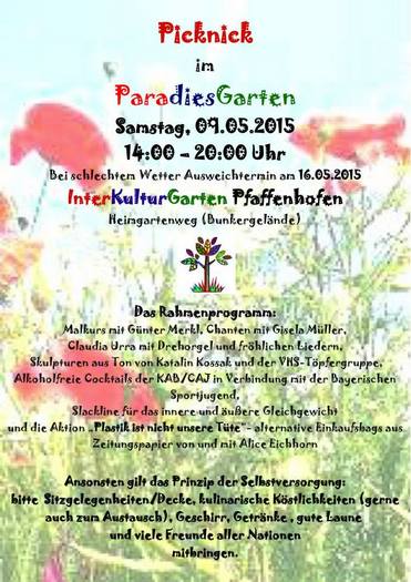 Der InterKulturGarten Pfaffenhofen im alten Bunkergelände am Heimgartenweg feierte ein Picknick im Paradies-Garten. Bis in den späten Nachmittag war ein buntes Programm an Kreativität und Begeisterung geboten, das der Platzregen mit Gewitter kaum unterbrechen konnte.