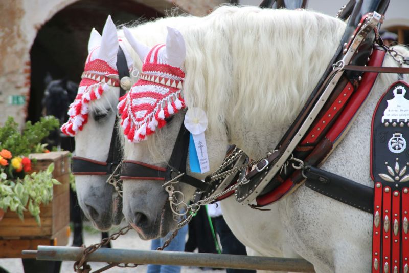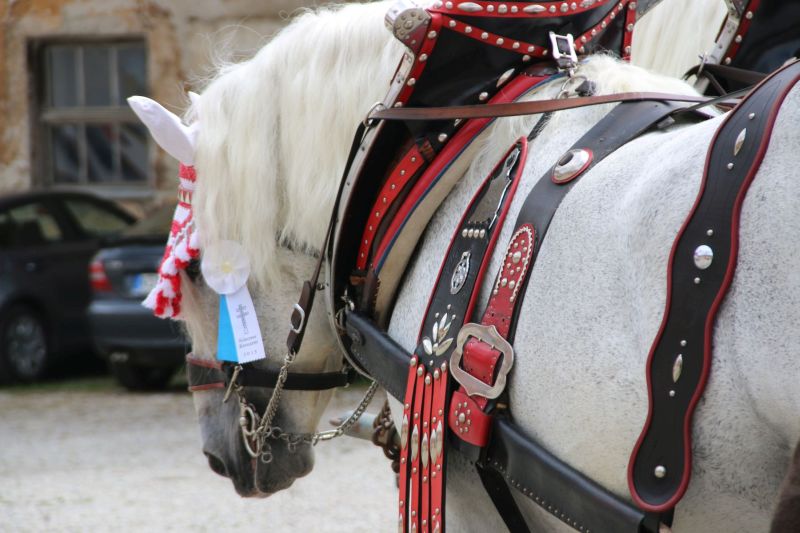 Um 14:00 Uhr setzt sich dann eine Prozession bestehend aus mehr als 40 Pferden, vielen Reitern und noch viel mehr Fußgängern in Bewegung, die vom Prielhof um die Scheyrer Weiher herum Richtung Mitterscheyern zieht, an der Hammerschmiede Richtung Ortsmitte Scheyern abbiegt und schließlich im Innenhof des Klosters am Außenaltar Aufstellung nimmt, um dort die Segnung der Tiere zu empfangen, aber auch für Gärten, Felder, den Wald und eine gute Ernte zu beten.
