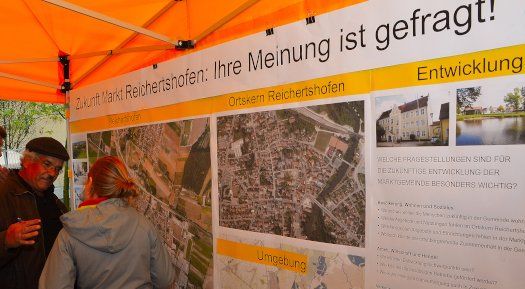 Nach einer intensiven Analyse der Bestandssituation werden die Ziele für die zukünftige Entwicklung der Marktgemeinde von einem Münchner Stadtplanungsbüro formuliert. Darin fließen auch die Meinungen der Bürger ein. Die erste Beteiligungsveranstaltung war bereits am 1. Mai beim Maibaumfest am Oberen Markt. Zahlreiche Bürger haben sich an diesem Termin bereits Gedanken gemacht und ihre Wünsche und Vorstellungen in Wort und Schrift artikuliert.