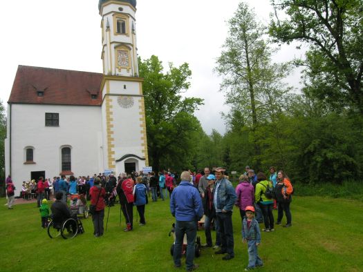 Das Wetter war durchwachsen, als sich am Sonntag, dem 17. Mai 2015 rund 200 Erwachsene und Kinder vor der Schlosskirche St. Nikolaus in Schenkenau trafen, um gemeinsam am 3. Familienwandertag auf den Kapellenwanderwegen St. Nikolaus und St. Wendelin teilzunehmen. Darunter waren auch zahlreiche Walker.
