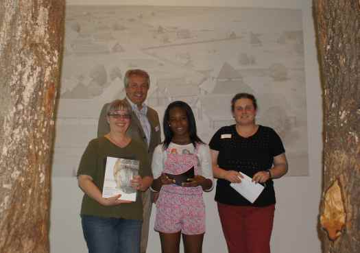 Museumsleiter Dr. Wolfgang David überreicht Sylvia (hier mit Klassenlehrerin Margit Amereller und Archäologin Barbara Limmer M.A., krm), der 200.000ten Besucherin, ein kleines Präsent; Foto: Maria Meßner M.A., krm