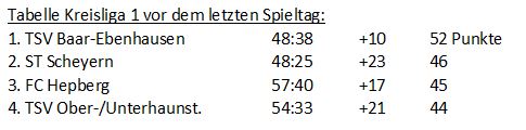 Durch das gleichzeitige 0-0 Unentschieden des TSV Ober-/Unterhaunstadt gegen den als Meister feststehenden TSV Baar-Ebenhausen hat es der ST Scheyern im letzten Saisonspiel gegen den TSV Etting jetzt wieder selber in der Hand, den Relegationsplatz für sich zu reservieren. Ein Sieg am kommenden Sonntag und jedes Rechenspiel wird überflüssig, dann ginge es in der ersten Runde der Relegation in Hin- und Rückspiel gegen den bereits feststehenden Tabellenzweiten der Kreisliga 2, den FC Finsing. Sollte man sich hier durchsetzen können, wären noch 2 Spiele gegen den Tabellen-Viertletzten der Bezirksliga zu absolvieren.