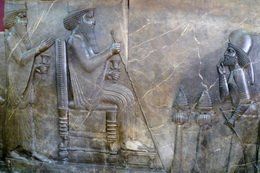 2500 Jahre altes Relief aus Persepolis- König Darius empfängt einen Gesandten; Mädchen in ihrer Schuluniform