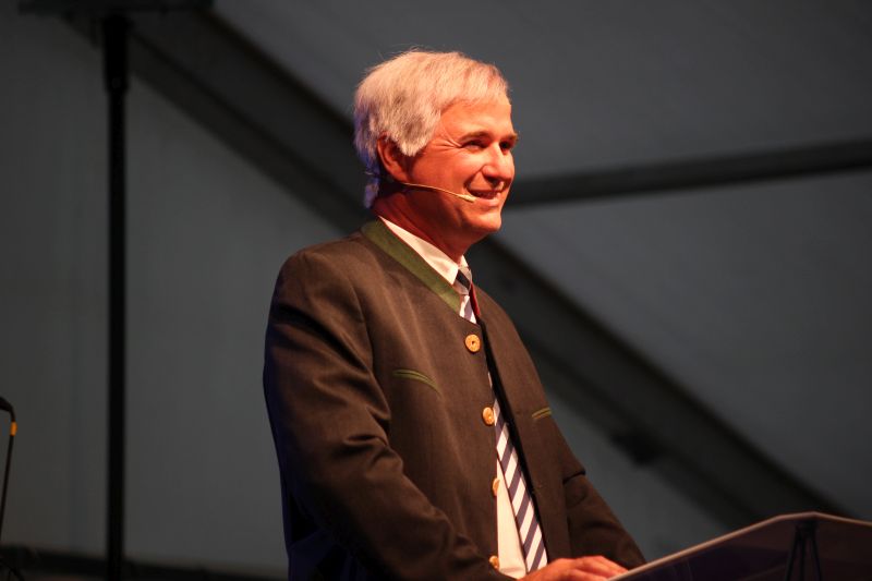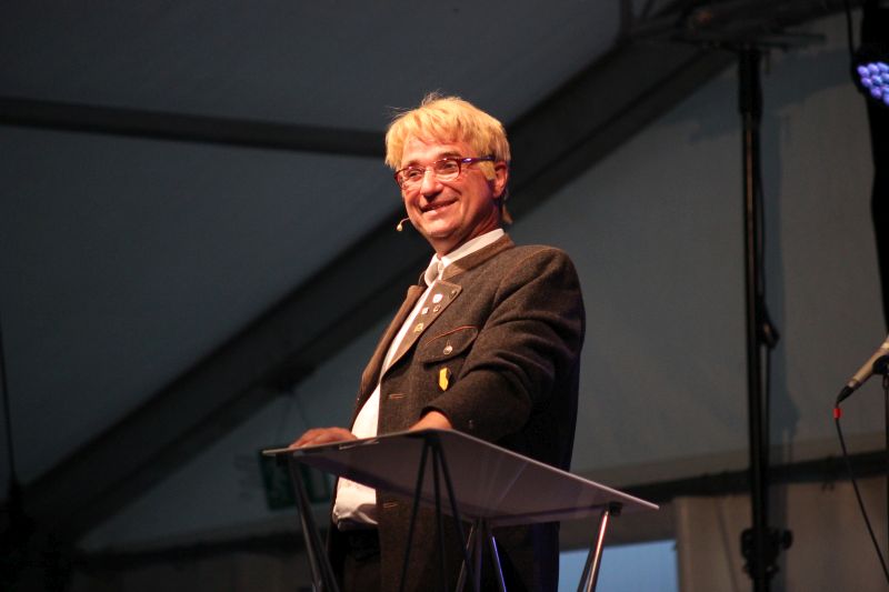 Einige der großen Worte, die er den bayrischen Ministerpräsidenten so in den Mund legt, sind weitläufig bekannt. Seehofers "Konsequent oder inkonsequent, aber nicht immer dieses ewige hin und her" etwa oder auch Stoibers "Das Fundament ist die Basis aller Grundlagen". Allein, hören tut es das Publikum immer wieder gern, kann man sich doch die Typen hinter diesen Aussagen jedes Mal aufs Neue wieder so richtig vorstellen. Aber Wolfgang Krebs wäre nicht er selbst, würde er nur Konserven vortragen. Immer wieder eingemischt in die von ihm skizzierten Szenarien sind aktuell politische Themen ebenso wie der Bezug zum Ort der Veranstaltung. "Ihren Namen kenne ich ... Moment, muss nur kurz auf meinen Zettel schauen. Ah! Bürgermeister Sterz." Nur in der falschen Partei sei der, so der doppelte Landesvater, zur CSU habe es ganz offensichtlich nicht gereicht.