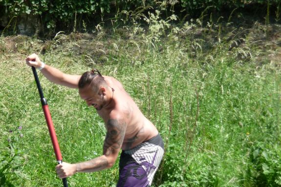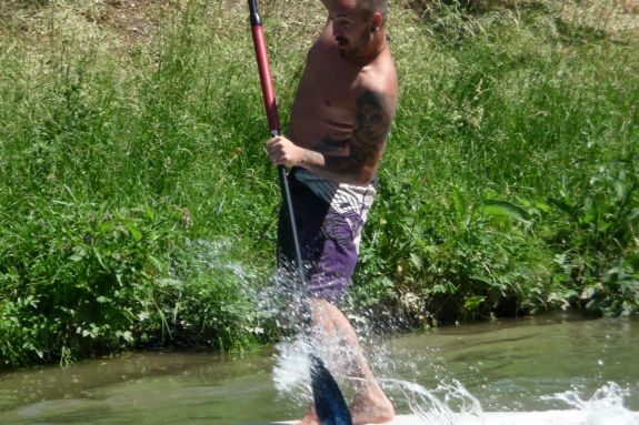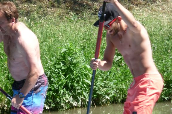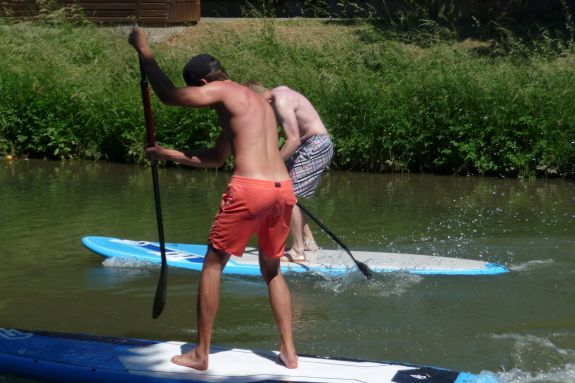 Die Teilnehmer jedenfalls, insgesamt 15 an der Zahl, standen souverän auf ihrem Brett und lieferten sich spannende Kopf-an-Kopf Rennen. Auf der etwa 200 m langen Paddelstrecke direkt auf der Abens wurde im Stehen gegeneinander gepaddelt, was das Zeug hielt. Schaulustige und Fans säumten das Ufer und heizten mit ermunternden Zurufen die Paddler kräftig an. Wer anfangs noch etwas wackelig auf den Beinen war, konnte von Runde zu Runde immer mehr an Standfestigkeit hinzugewinnen, um nicht stattdessen die sicherlich angenehme Wassertemperatur zu testen.