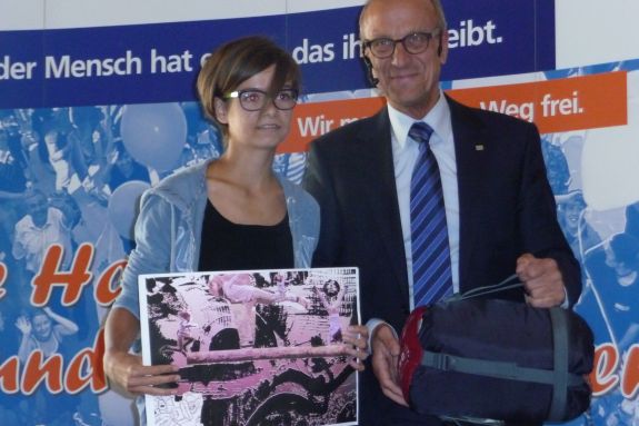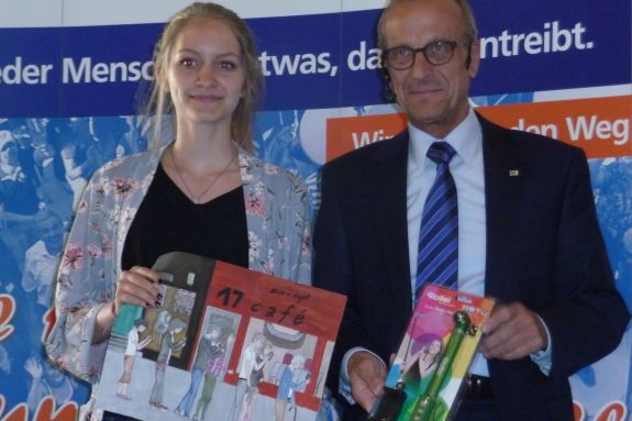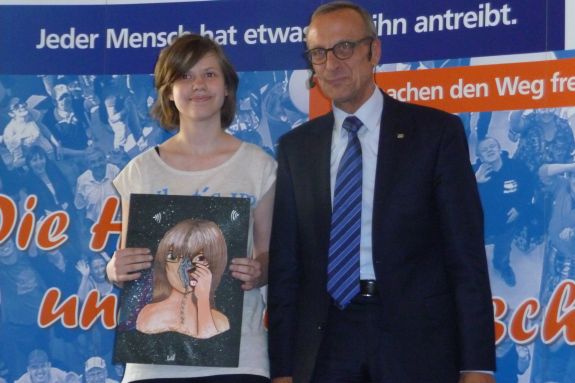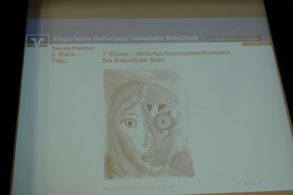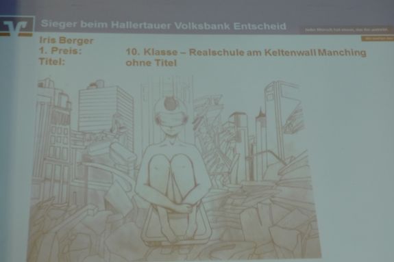 Er konnte mit seinem Bild sogar bei der Landesjury in München punkten und erreichte in seiner Altersgruppe den 4. Platz im Landesentscheid. Noch erfolgreicher war Neuntklässlerin Elena Vogler vom Hallertau Gymnasium Wolnzach. Mit ihrem eindrucksvollem Bild "Warnung in letzter Sekunde" kam sie auf den 3. Platz im Landesentscheid.