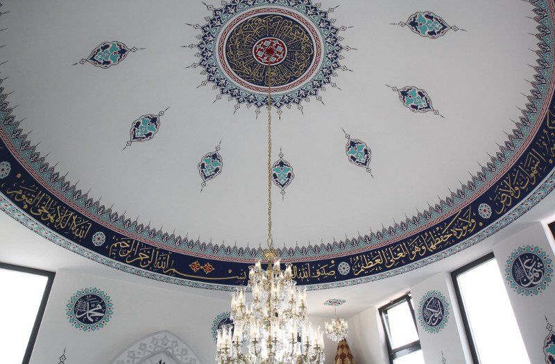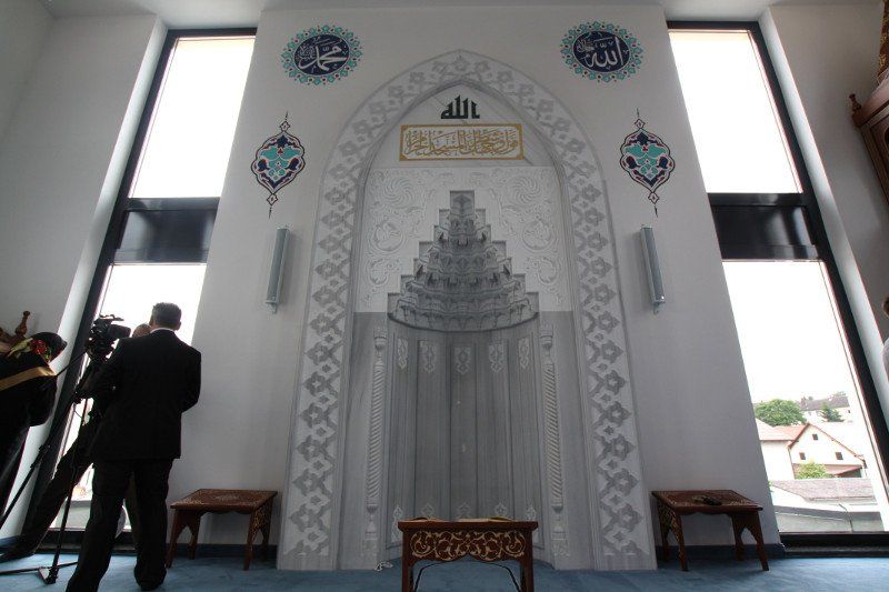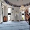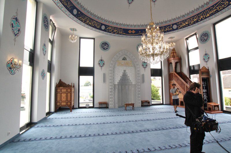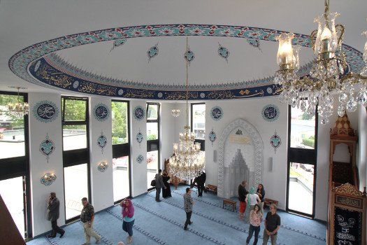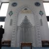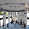 Unterdessen bestaunten viele Besucher die Moschee von innen. Im Erdgeschoss befindet sich zukünftig ein Bildungszentrum, das auch später von der Volkshochschule genutzt werden soll mit einem Saal, der gut 200 Personen fasst. Die eigentliche Moschee, oder der Gebetsraum, liegt dagegen im ersten Stock, den man auch von außen über einen Aufgang erreichen und in den man aufgrund der bodenlangen Fenster hineinschauen kann. Der Gebetsraum ist eine beeindruckende Mischung aus moderner Klarheit und traditioneller Ornamentik geworden. Der Nischenmihrab kombiniert das sanfte, helle Grau des Marmors mit einem sehr aufwändigen, aus einem Stück gemeißelten traditionellen Muqarnasgewölbe. Die gleiche Sorgfalt und Liebe zum Detail zeigt sich auch in den türkischen Ornamenten an den weißen Wänden und in der Kuppel.